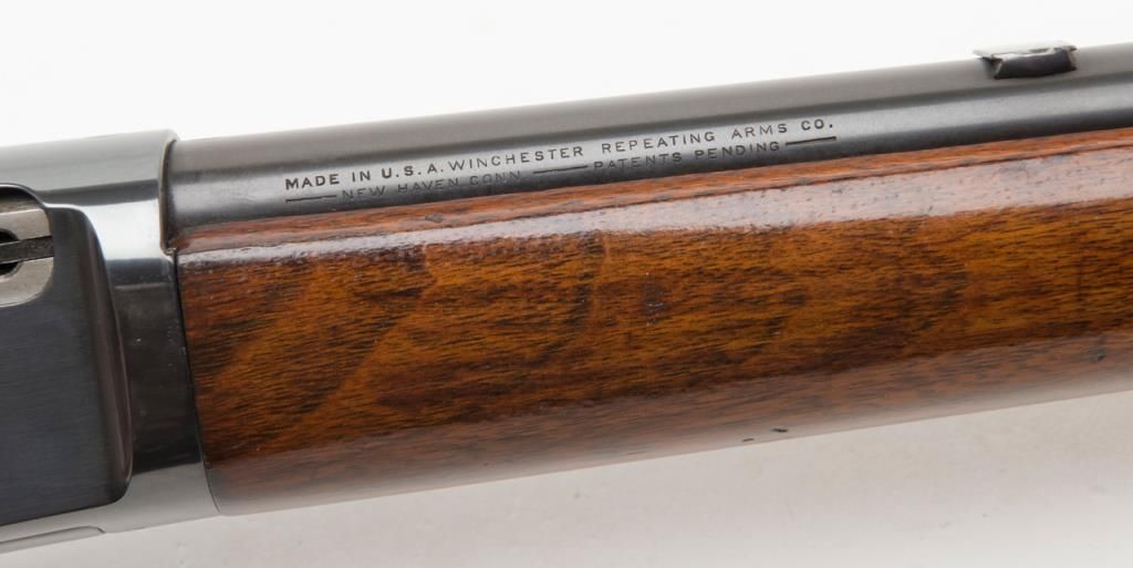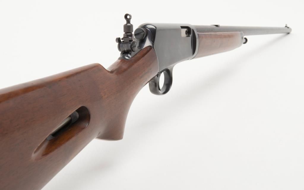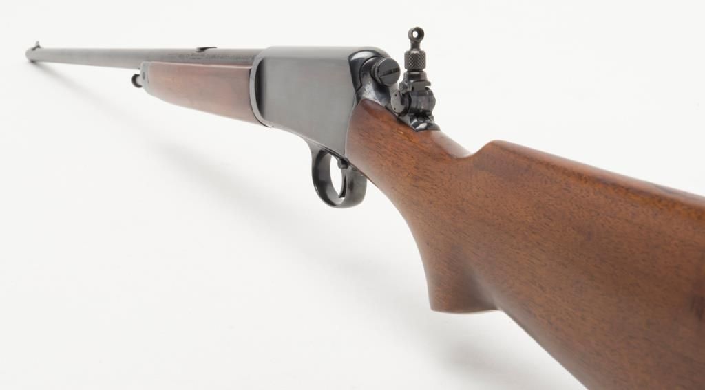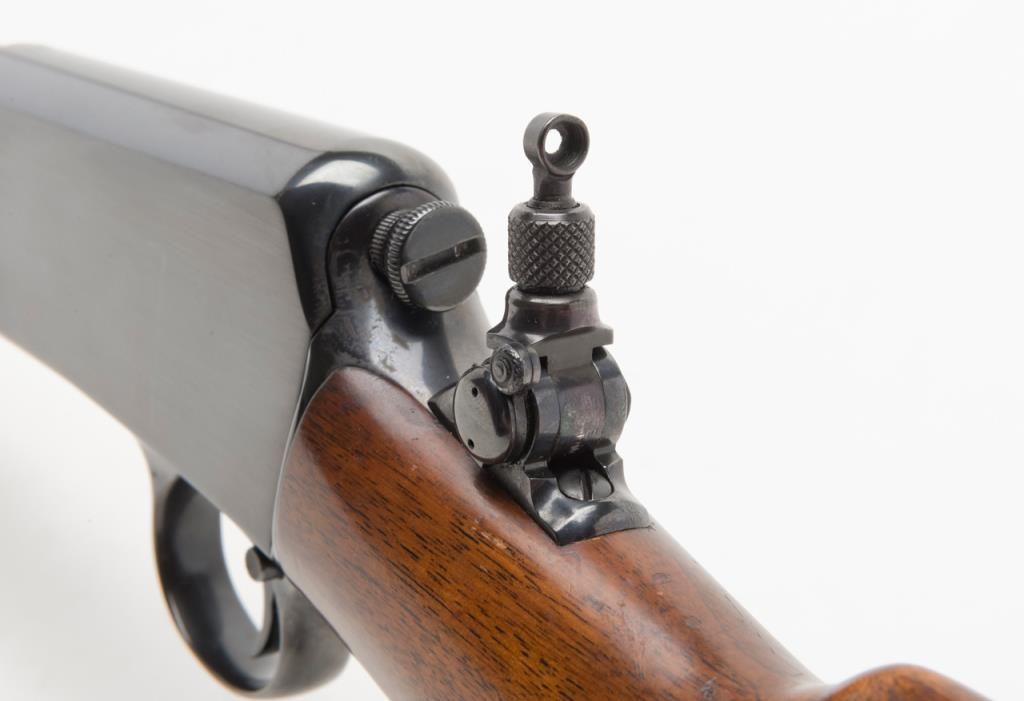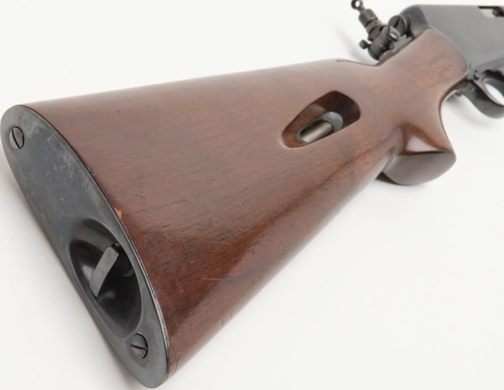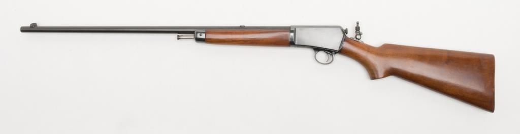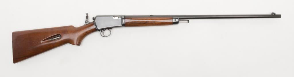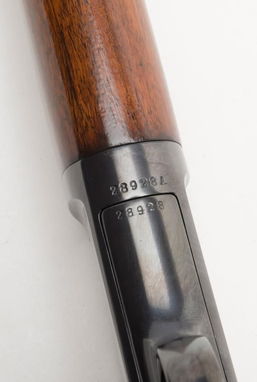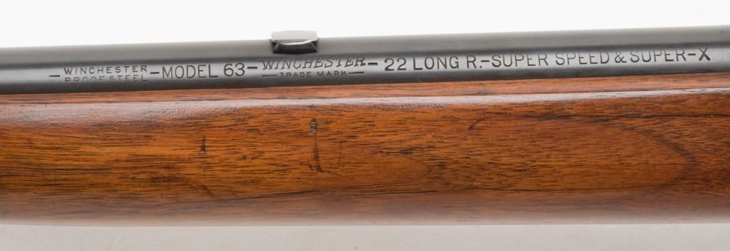 Winchester Model 63 semi-automatic rifle, .22 Long Rifle caliber, Serial #28928A. The rifle is in overall very good condition with a 23” blued barrel. The barrel retains nearly all of its blued finish with a post front sight with brassbead and rear sight removed. The action retains nearly all of its blued finish as well. The smooth wood stocks are in overall very good condition with a metal butt plate. The bore is very good, action crisp and markings sharp on this nice Model 63. A period tang sight has been added during the period of use. (C+R/PPT). Est.: $500-$1,000.
