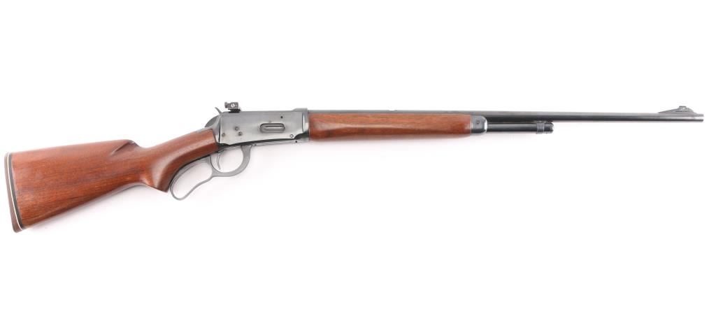 Lever action rifle manufactured pre-64, circa 1953. Features 24" barrel, 2/3 length magazine, ramped front sight with bead top blade insert, barrel dovetailed for rear sight (empty), receiver mounted Williams peep rear sight, curved pistol grip with matching lever, solid Pachmayr recoil pad with black & white spacers. Bore is excellent/bright. Retains 95% blue, with some minor scratches. Wood is very good condition with minor scratches, good wood to metal fit. Operation is smooth. Markings are sharp.