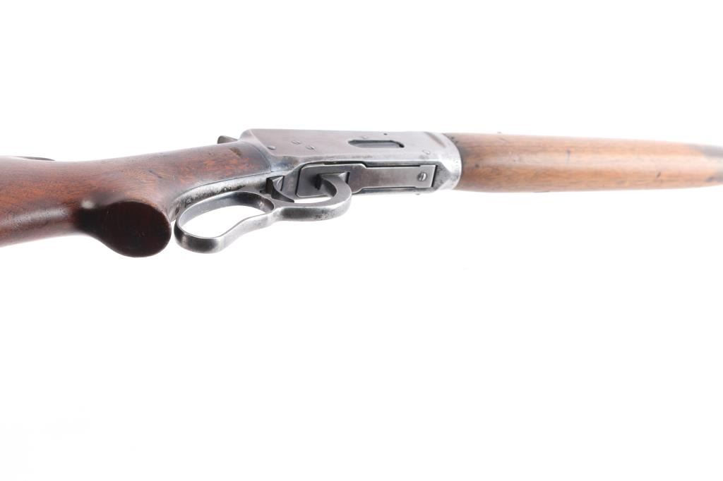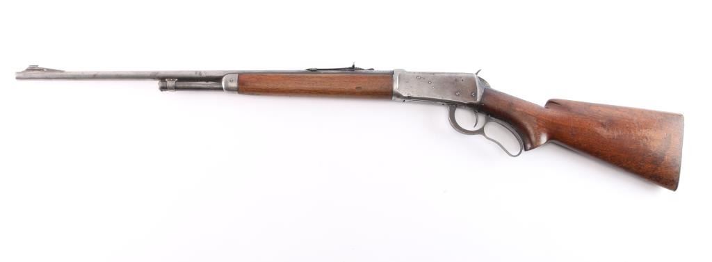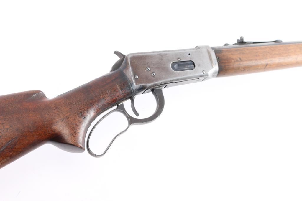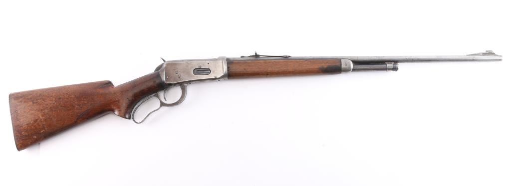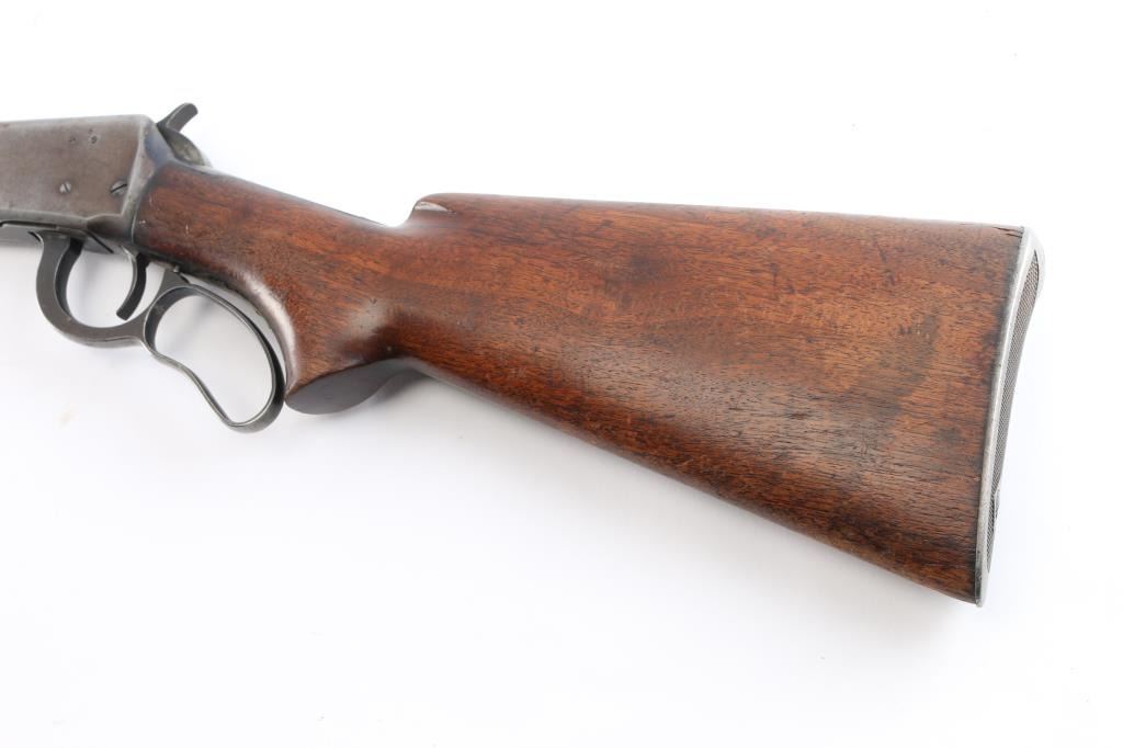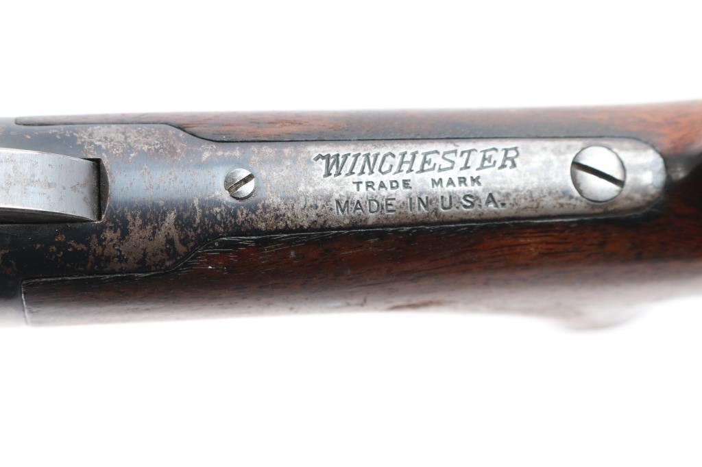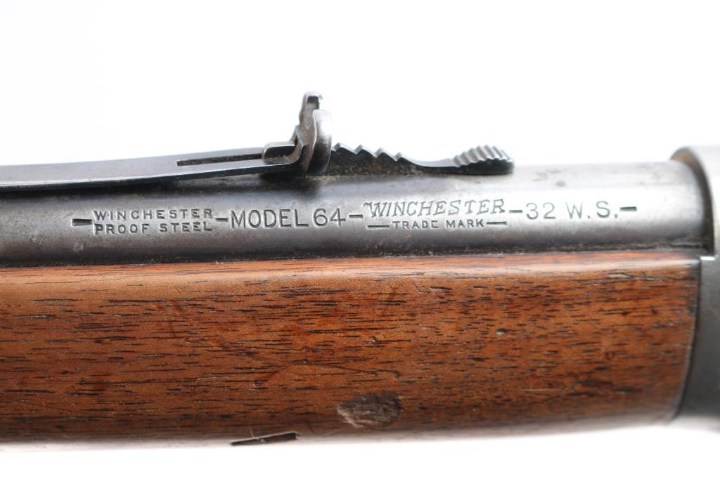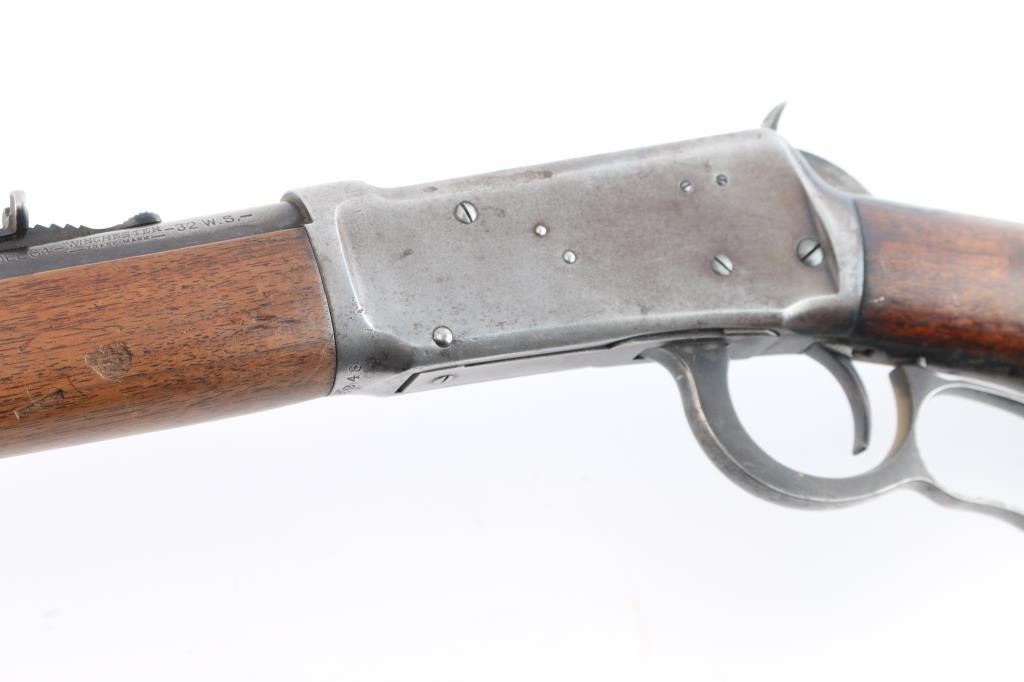 Vintage Winchester lever-action rifle chambered in .32 Winchester Special and manufactured in 1938 in New Haven, CT. The rifle maintains the standard Winchester markings including the factory proof on top of the barrel and receiver. It is equipped with a blade/bead front sight dovetailed on a ramp (missing removable hood), smooth curved trigger, checkered hammer spur, and a Winchester 22G sporting rear sight. It utilizes a two thirds length tubular magazine with a five cartridge capacity. The furniture is American walnut with a smooth semi-pistol grip stock, smooth forearm, and a checkered steel buttplate. It features a 24" round barrel with a dirty bore and strong rifling. The action is crisp and smooth. The original blued finish is approximately 20% with faded bluing, some edge wear, scratches, minor pitting, and light scattered rust. The wood is good displaying normal handling marks, and a few heavier dings on the handguard and two on the stock.