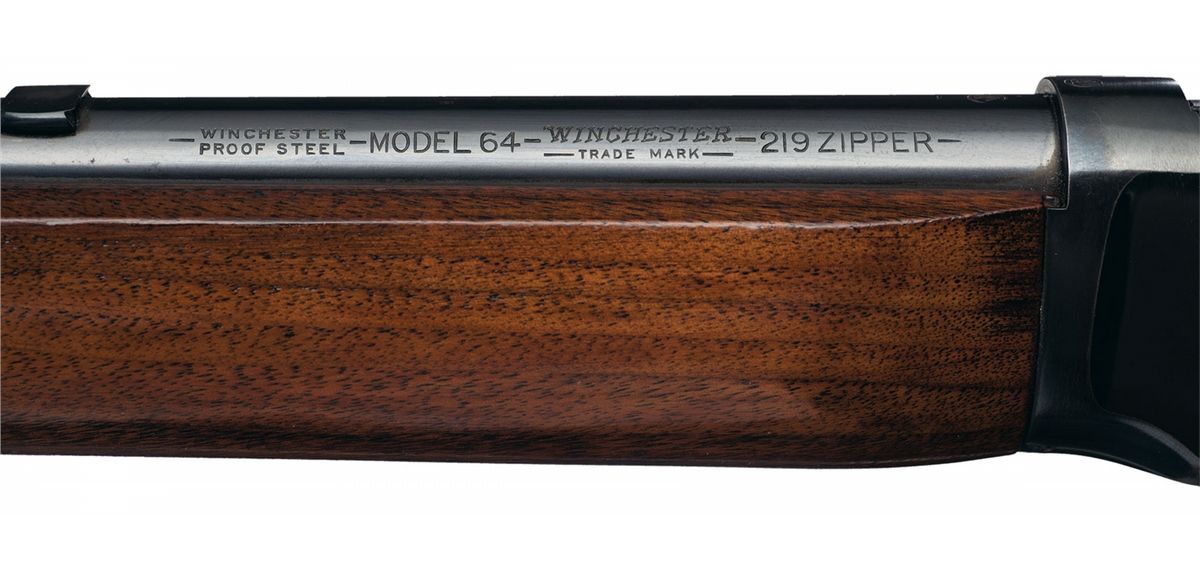 The .219 Zipper caliber was manufactured between 1937 and 1941. This example has hooded ramp front sight with stippled ramp, rear sight dovetail has a filler block and a bolt mounted adjustable rear peep sight. Mounted on a smooth semi-beavertail walnut forearm and pistol grip stock with checkered steel buttplate.