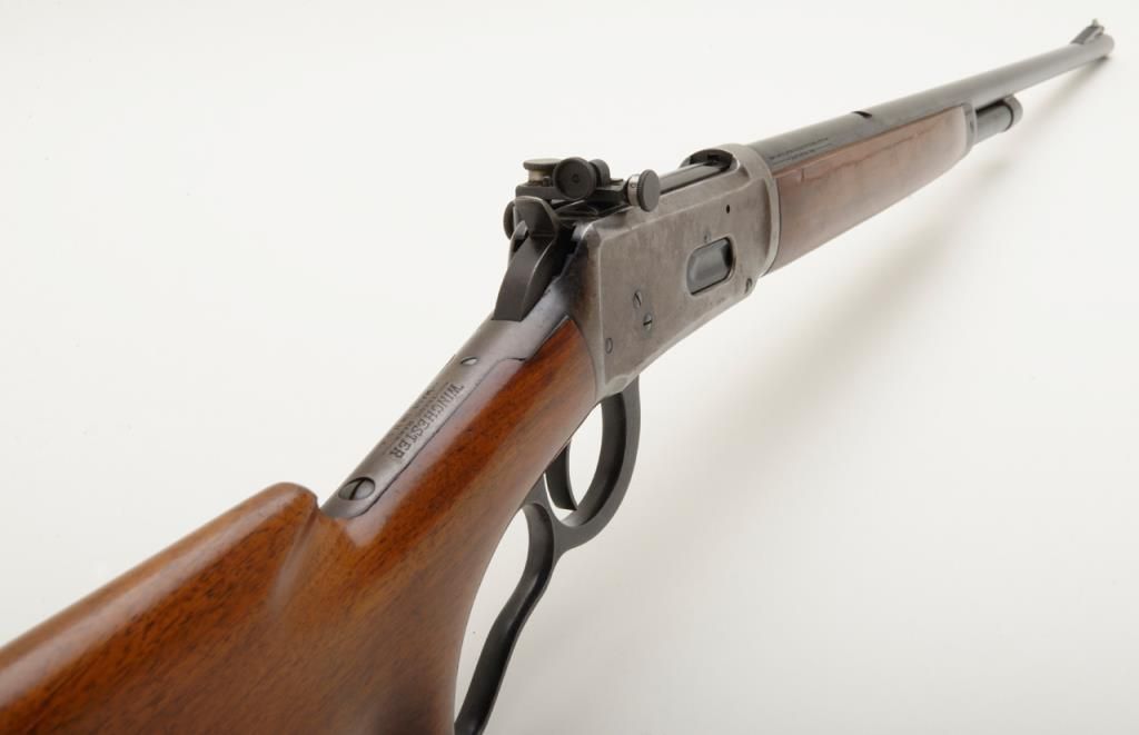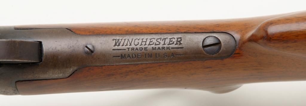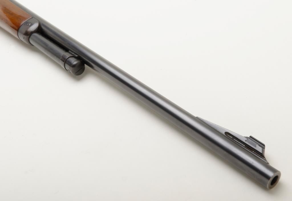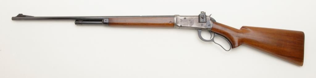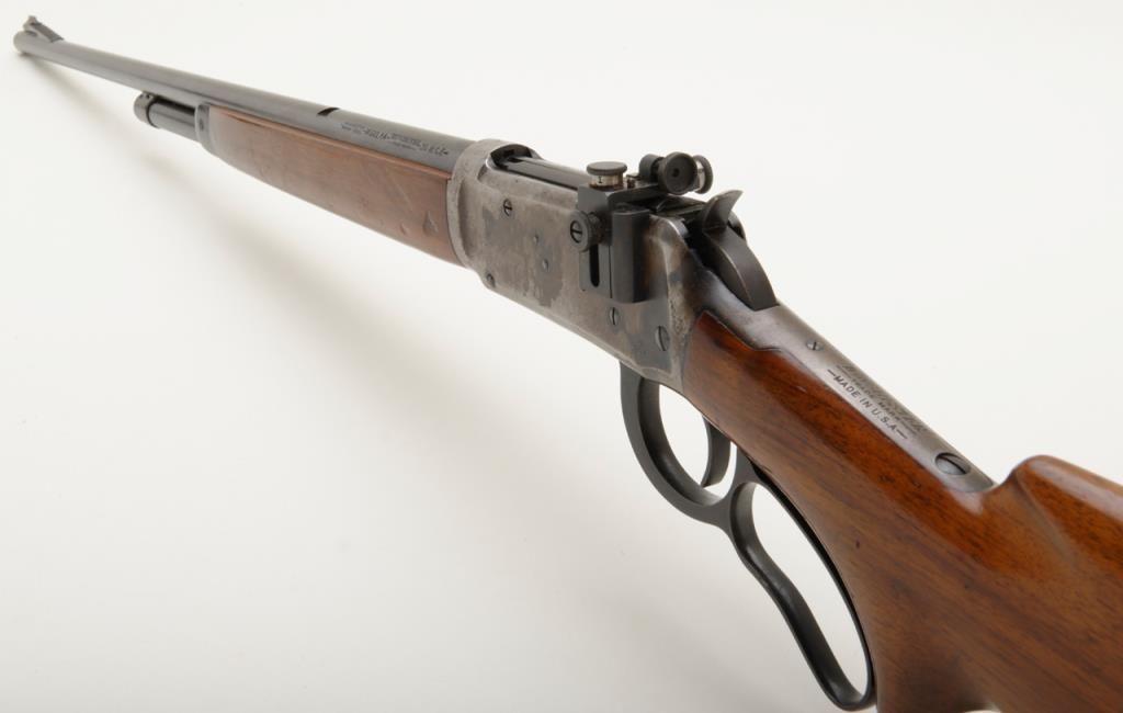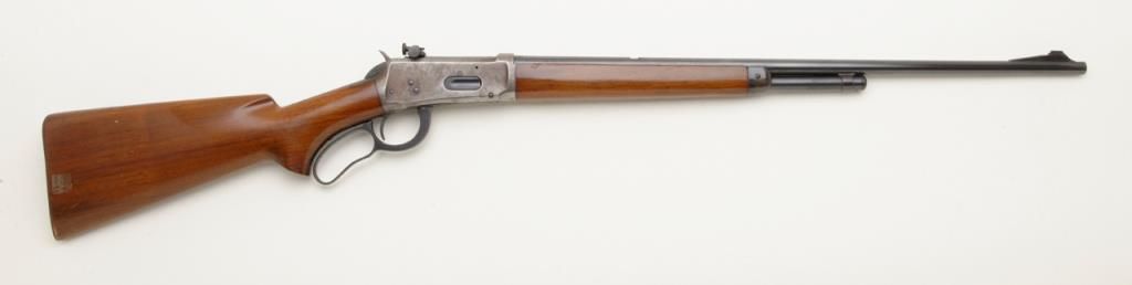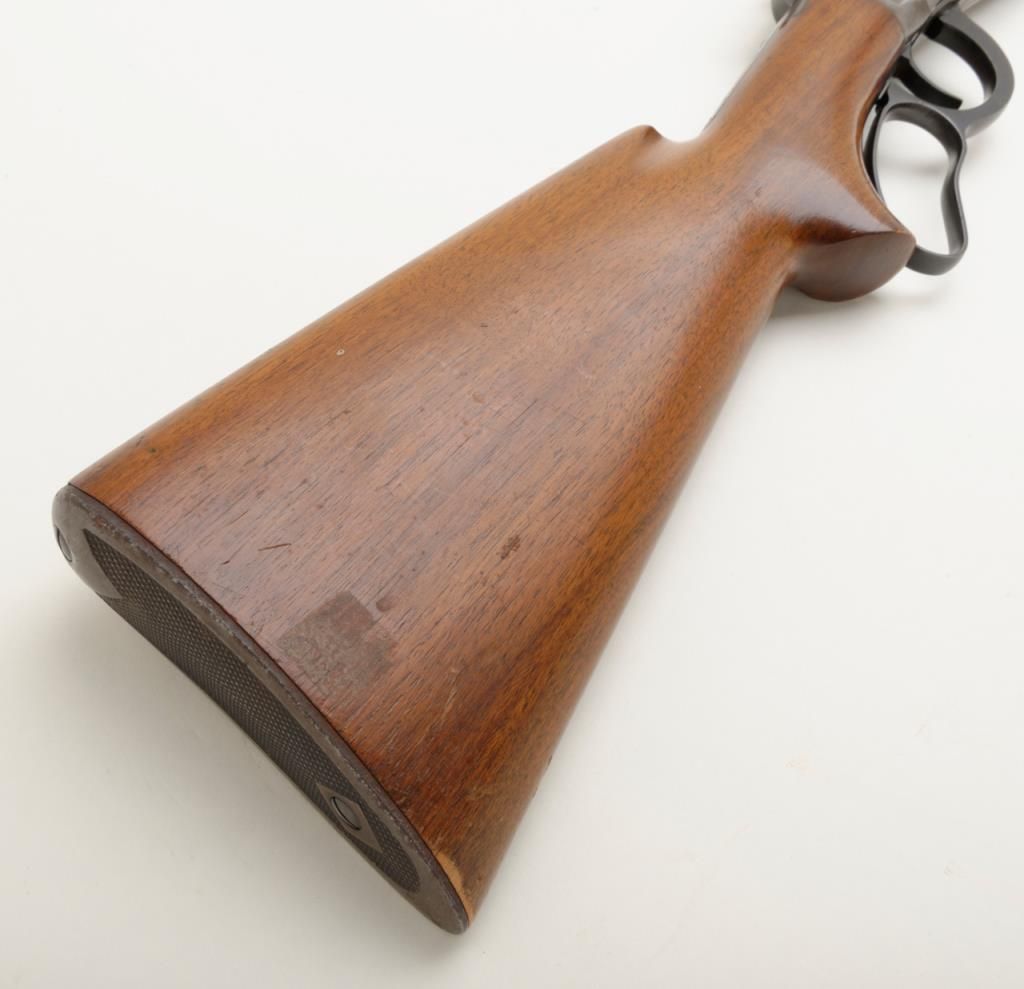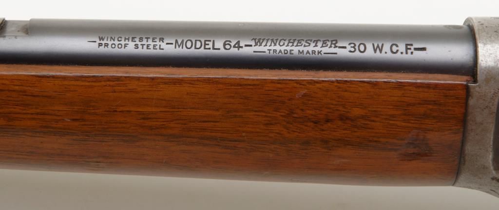 Winchester Model 64 lever action rifle in .30-30 Winchester caliber remaining in very good original condition and serial number 1096094. The barrel and magazine tube show 95% to 98% original finish. The fore end cap shows 75% to 85% finish which is starting to drift. The frame has drifted and retains 5% to 10% blue with balance a gray to brown patina. The receiver has been mounted with a Lyman number 56 receiver sight. The stock is very good with some compressions, dings, mars and dents. The original milled steel butt plate is retained. The action is crisp and the bore is very good plus and may clean to excellent. Est.: $500-$1,000