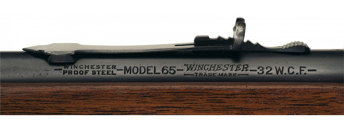Winchester manufactured only about 5,700 Model 65 rifles from 1933 to 1947. The left rear of the barrel is marked "-WINCHESTER/PROOF STEEL-MODEL 65-WINCHESTER/-TRADE MARK- 32 W.C.F.-", the top of the barrel and receiver at the breech are marked with the Winchester oval proof, the upper tang is marked "WINCHESTER/-TRADE MARK-/-MADE IN U.S.A.-" and the serial number is on the bottom of the frame. Hooded ramp blade front and adjustable rear buck horn sights, half magazine tube, all blue finish and mounted with a smooth walnut forearm and pistol grip stock with a checkered steel shotgun buttplate. Winchester Model 65's in 32-20 caliber are scarce.
