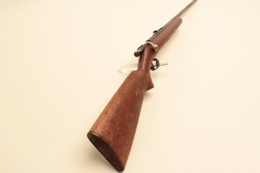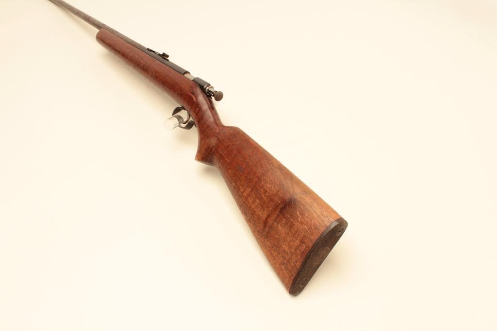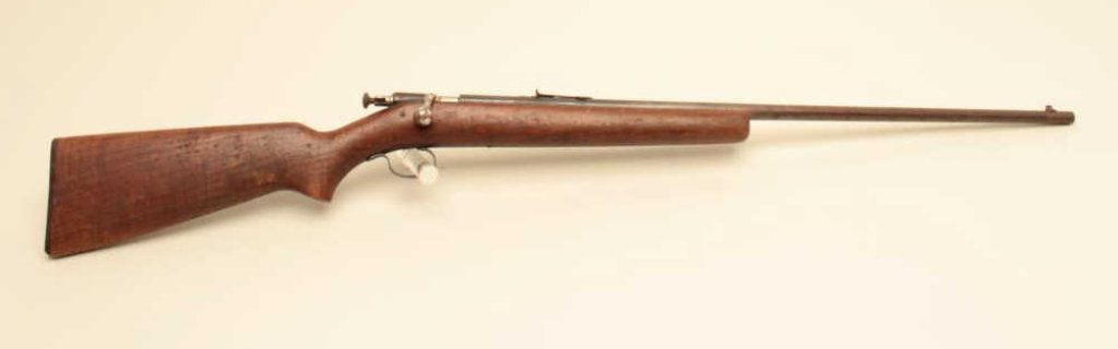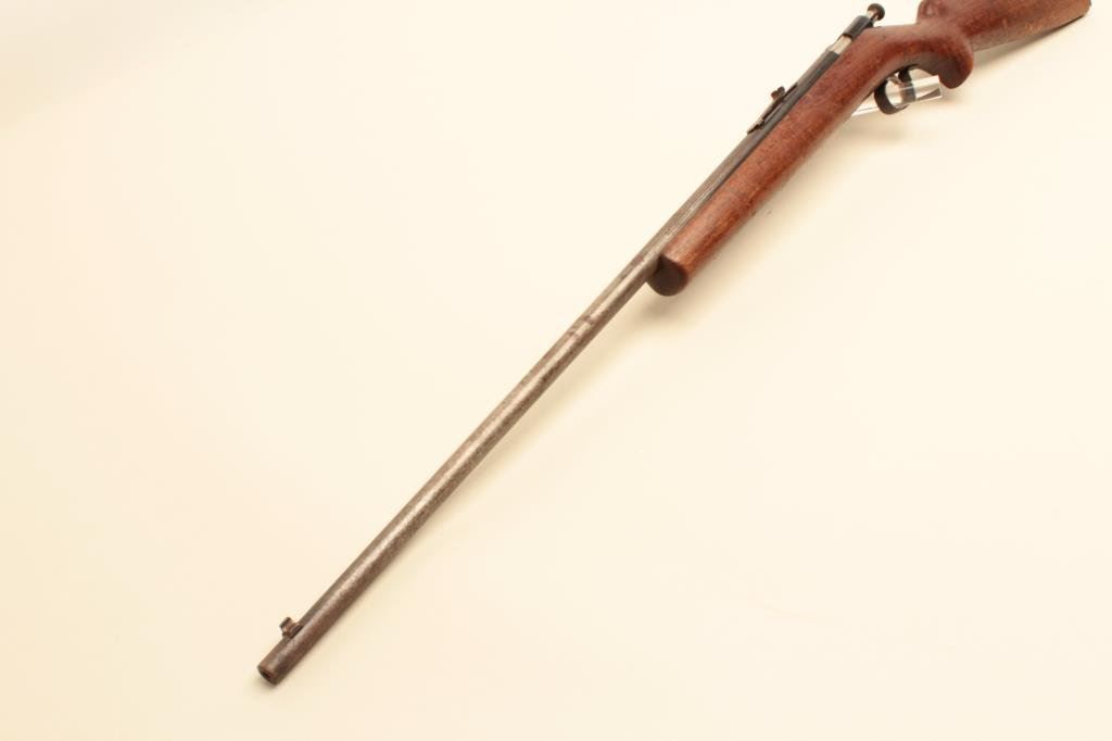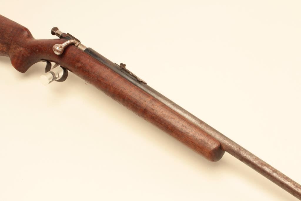 Long Rifle caliber, Serial #NSNV. The rifle is in fair overall condition with a 27” barrel. The barrel and receiver retain a significant amount of their blued finish with the remainder going to a grey patina with light to moderate surface rust and some pin prick pitting. The smooth wood stock is in fair condition having lost significant finish due to poor storage. The butt ends with a Winchester marked plastic butt plate. The bore is fair with some rust and pitting noted. The action functions and the markings are legible. Est.: $150-$300. (Modern).