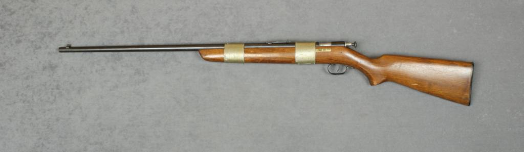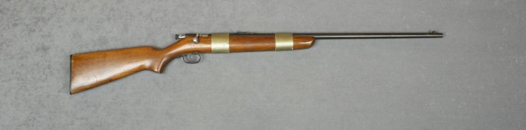 Winchester Model 67 bolt-action rifle, .22 short, long or long rifle caliber, 27” round barrel, blue finish, wood stock, #NVSN. This gun is in overall good condition showing the majority of its original finish on the barrel with some scattered erosion and pin prick pitting, good bore, action and markings, missing screw that attaches the stock to the barrel/receiver; stock is overall good with some scattered nicks and scratches from carry and storage and two wraps of duck tape to hold the stock onto the barrel. Est.: $100-$200.