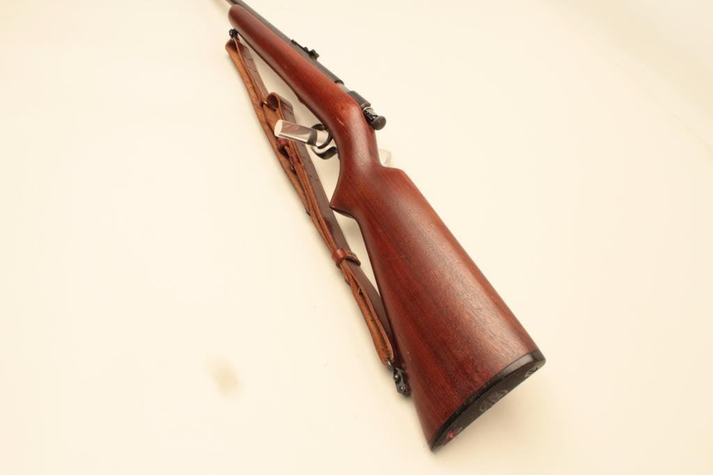 LR caliber, blued finish, wood stock, leather sling, no visible S/N, in overall very good to fine condition with majority of original finish to metal surfaces, very good bore, crisp action and markings, very good + wood stock. (Modern). Est.: $125-$250.
