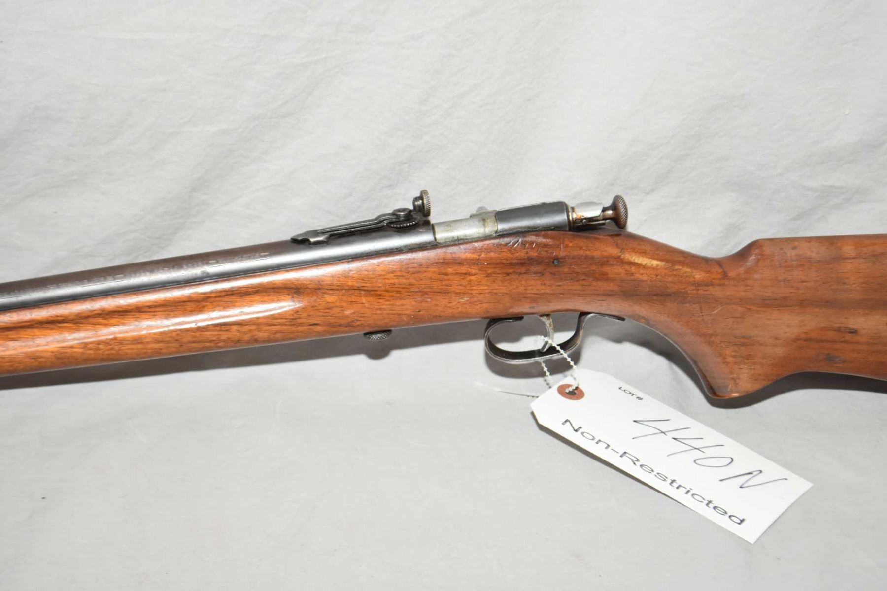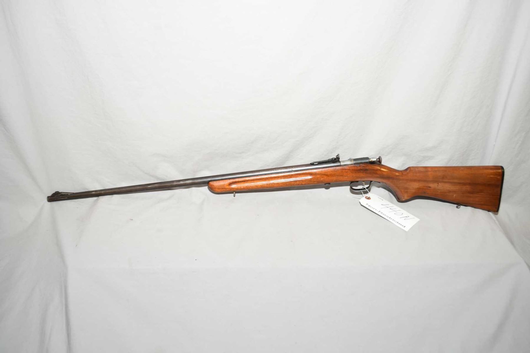 Winchester Model 68 .22 LR Cal Single Shot Bolt Action w/ 27" bbl [ blued finish starting to fade with some slight pitting, peep style rear barrel sight pistol grip stock w/fluted forend chipped at toe, also butt plate chipped at toe, ring style screws for sling ] Ser # Nil