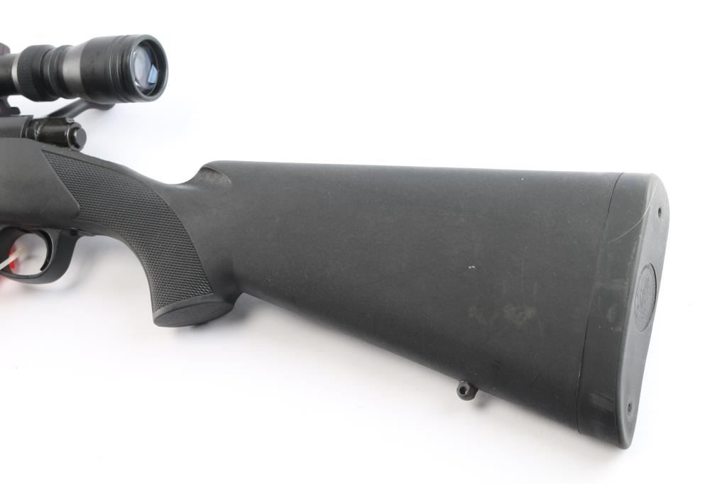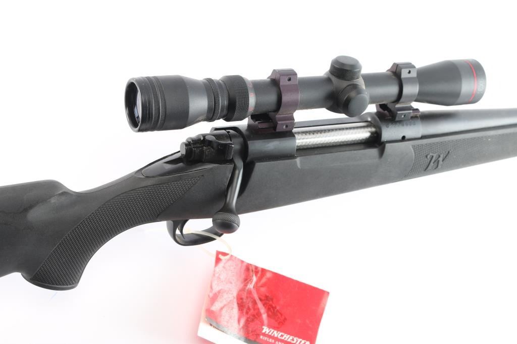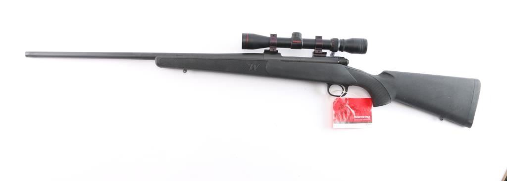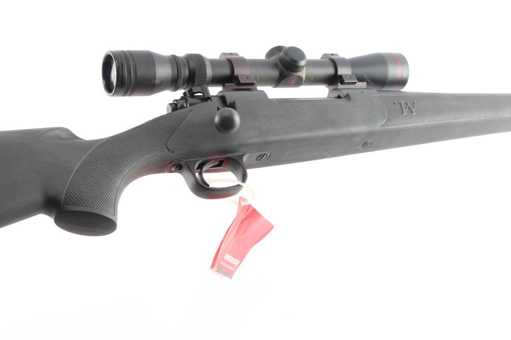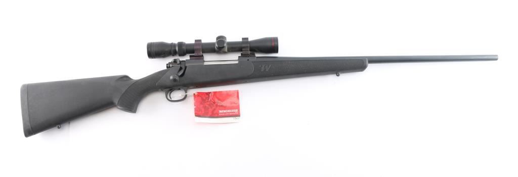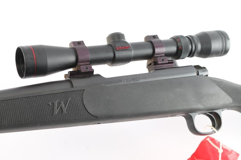 American made bolt-Action Model 70 manufactured after 1992 in New Haven, CT. It features an approximately 24" round tapered barrel, serrated curved trigger, blind magazine, knurled bolt handle, jeweled bolt body, no iron sight provisions, push feed action, matte blued receiver that is drilled and tapped for optics. The barrel, receiver, trigger assembly, and 3-position manual safety all have a blued finish. A polymer stock has a checkered semi-pistol grip stock, checkered forend, factory rubber recoil pad, and sling swivel studs. The stock is excellent. The action is smooth and tight. Winchester proofs on receiver and barrel are sharp. The matte blued finish is excellent with approximately 98% remaining showing only superficial blemishes from storage. The bore is bright and the rifling is strong. This rifle comes with two piece rail sections installed, rings, and a Simmons 3-9x32 scope with a duplex reticle.