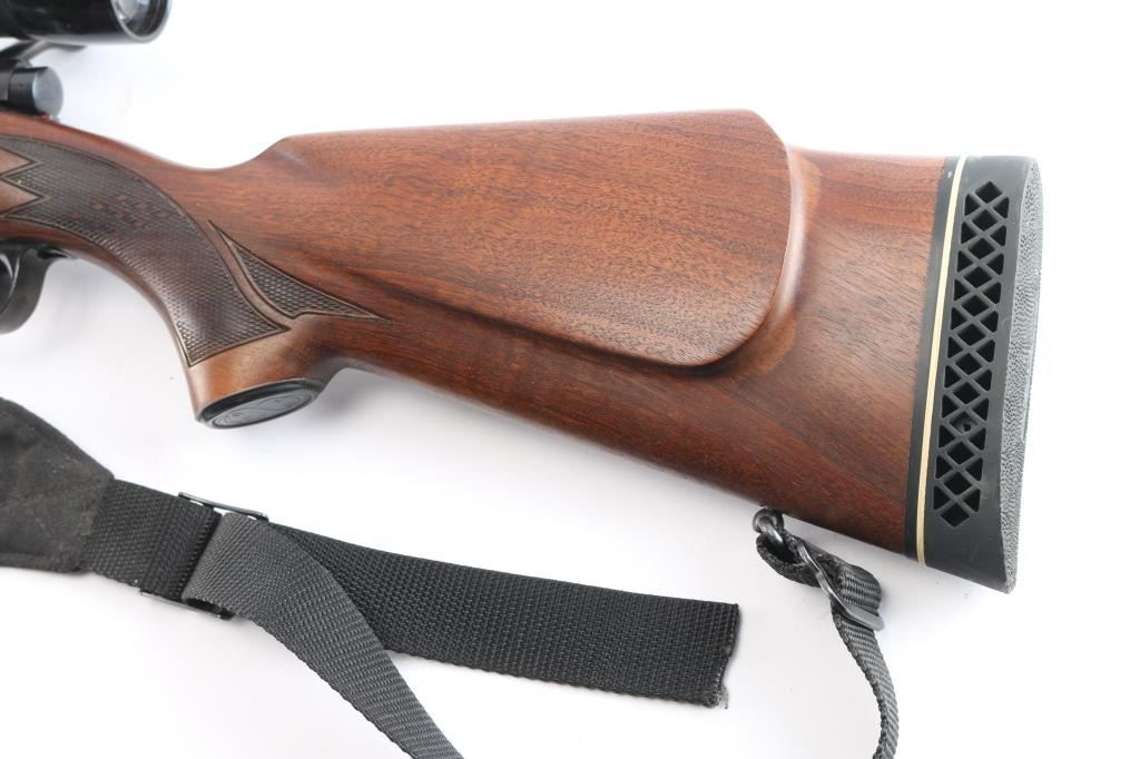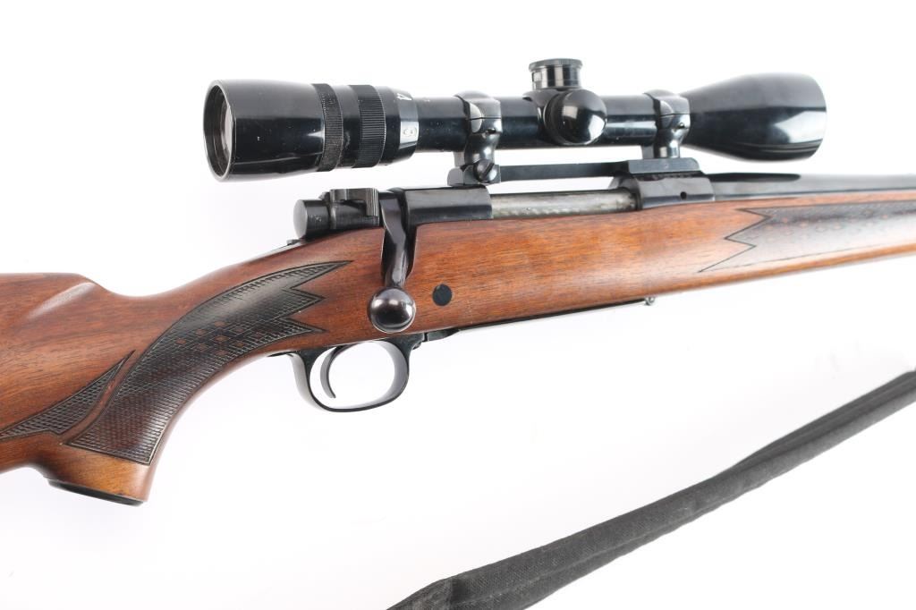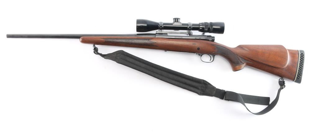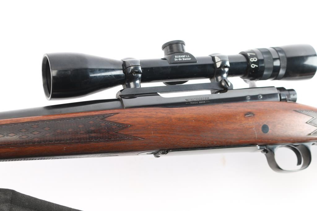 American made bolt-action Model 70 chambered in .30-06 Springfield manufactured in 1967. It features a 22" round blued tapered barrel, front and rear sights removed, Mauser style action, blued receiver drilled and tapped for optics, serrated curved trigger, jeweled bolt body, 3-position manual safety, hinged floorplate, Monte Carlo style semi-pistol grip stock, sling swivels in the buttstock and forend, metal grip cap, and ventilated rubber recoil pad. Wood is very good, and has been refinished. The bore is bright with strong rifling. The action is smooth and tight. Metal markings are crisp and clear with Winchester proofs on receiver and barrel. The blued finish is excellent with approximately 99% remaining, and there is little remarkable to speak of. Comes with a nylon sling, a Bushnell 3-9x banner scope with a duplex reticle, and Redfield scope mount and rings. There is rust on the front of the scope mount. The 'Near' condition grading was given because the stock is refinished, and the scope mount is not part of the grading scale.