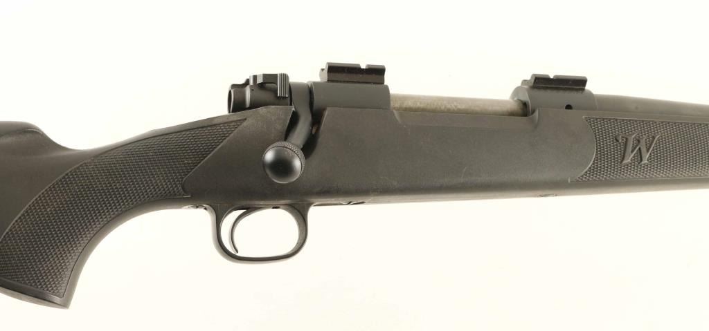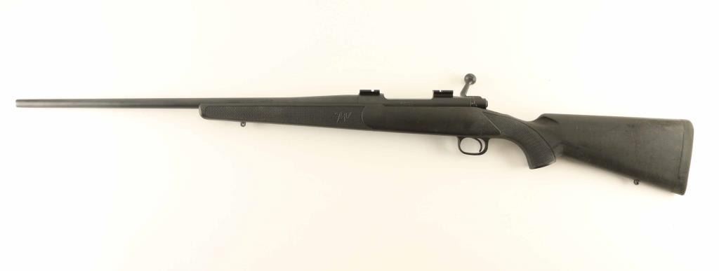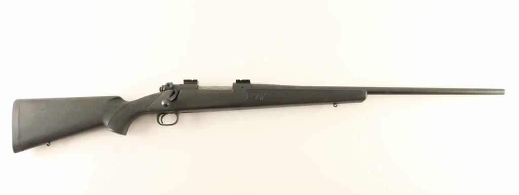American made push feed bolt action sporting rifle chambered in .30-06 Springfield. Configuration: Matte black finish, 24" tapered barrel without provisions for sights, installed two-piece scope base, engine turned bolt with swept back handle, three-position safety, serrated trigger, 'blind' internal box magazine with synthetic follower, synthetic trigger guard, and checkered factory black synthetic pistol grip shoulder stock with sling swivel studs & rubber recoil pad. Rifle exhibits approximately 95% of it's matte black finish showing light wear and a small amount of light surface rust. Action is smooth, the bore shows good lustre & rifling with scattered pin prick pitting and the synthetic stock is good with scuffs & scratches. Condition is NRA Good++ ***Modern Firearm***