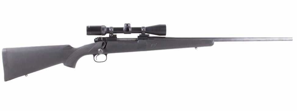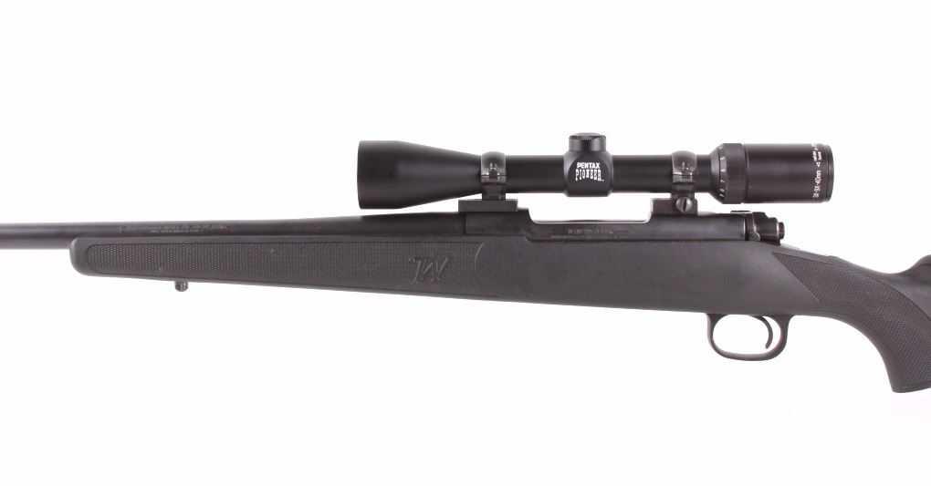 Offered for sale is a Winchester Model 70 .30-06 bolt action rifle with Pentax pioneer scope. The rifle features a matte blue'd finish, synthetic pistol grip stock, 23 3/4" barrel, and jeweled bolt. Nicknamed the "Rifleman's Rifle" by many because for more than 70 years, the bolt action rifle has been praised by law enforcement and the military for its precision, accuracy and performance. Developed in 1936 the model 70 has undergone few changes of design since its original development. This rifle has a matte finish, high impact polymer frame and a jeweled bolt. The gun is very clean, with little visible barrel wear, and no visible stock damage. Overall the condition of the rifle is good for its age. Serial number: G2575416. Modern rifle, FFL transfer or NCIS background check required. Overall length is 44 7/8"