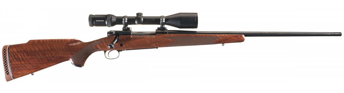 Barrel manufactured without sights. Ported muzzle, jeweled bolt and follower. Checkered pistol grip stock with sling swivel studs and a vented White Line recoil pad. Equipped with a Swarovski 3-12 x 50 Habicht Scope.