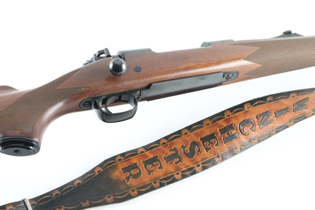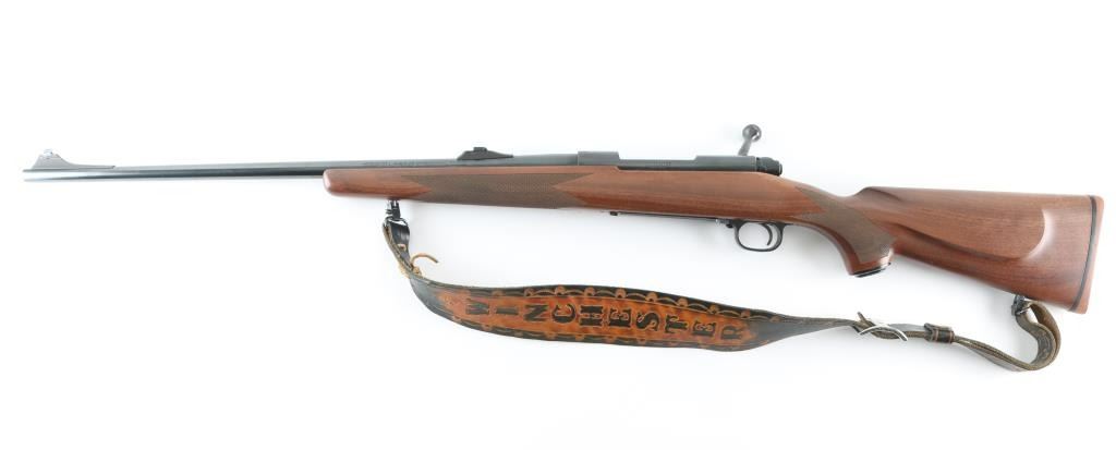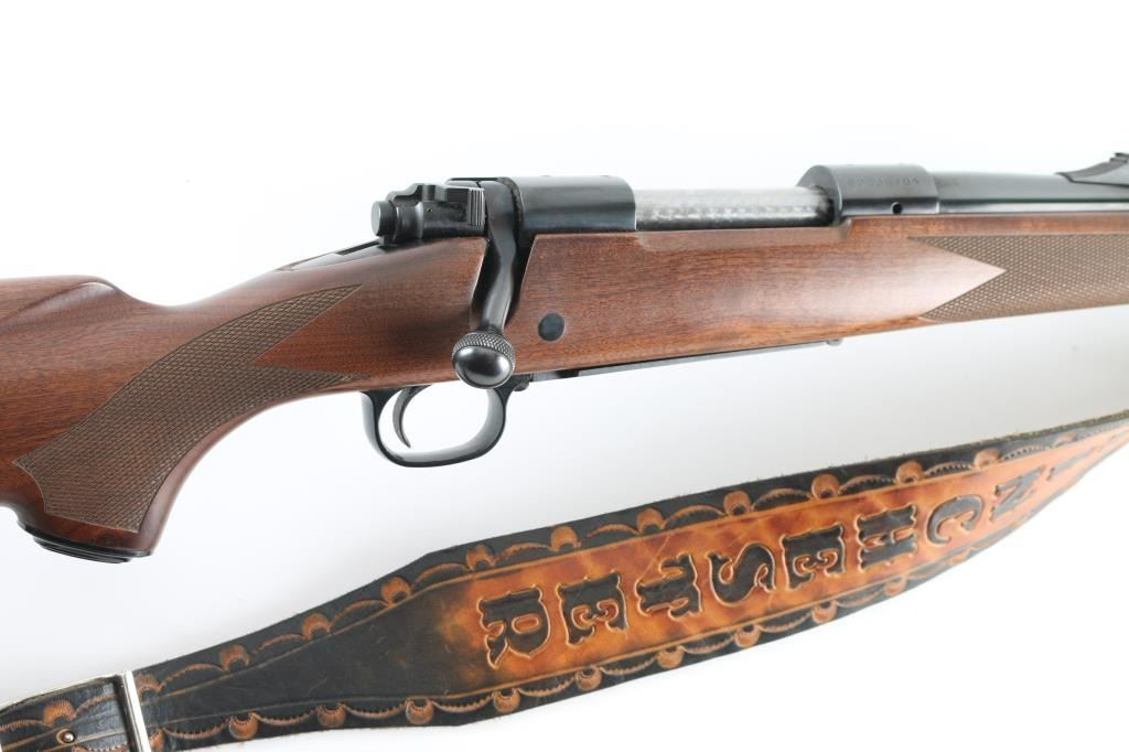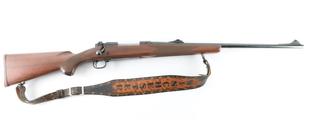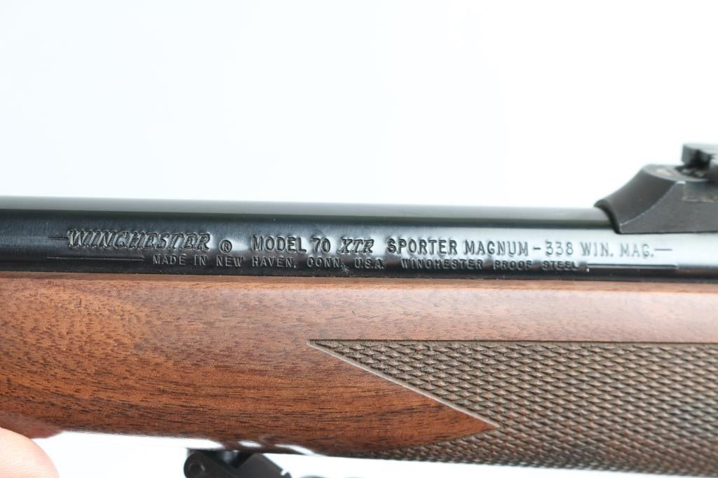 This American made Model 70 'XTR Sporter Magnum' circa 1991 features a 24" blued barrel and matching receiver with a raised ramp blade front sight, flip up adjustable rear sight, hinged floor plate, serrated trigger and jeweled bolt. The very nice straight grain wood stock has checkering at the wrist and forearm, a cheek rest, sling swivels with a leather Winchester sling, thin Winchester rubber butt pad and black metal grip cap. Metal finish looks great with little signs of use. There is a tiny bit of residue from shim tape on the top of the receiver where a scope had been previously mounted, will come right off when you clean it. The wood stock looks great with nary a sign of use. The Bore looks good but dirty, needs cleaned. LOP is 14". Condition is NRA Excellent *Modern Firearm*