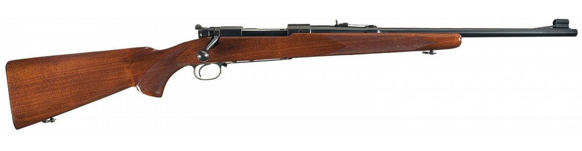 Manufactured in 1937 (receiver). Hooded ramp front sight and elevation adjustable rear sight with the Winchester legend marked on the left barrel side and the two line address marked on the right side. Winchester factory oval proof stamped on the left side of the barrel and receiver at the breech. The underside of the barrel is marked "C.M.S." followed by "25-35 WCF (triangle)" [double stamped] and "34". Pre-war receiver tapped for scope mounting at the front and tapped for sight mounting on the left rear sight. Pre-war safety, polished bolt numbered to gun, solid bolt knob, sling swivels and cloverleaf receiver tang. The straight comb pistol grip stock features checkering and a checkered steel buttplate. Note that 25-35 WCF has been reported as non-standard chambering for the Model 70 line.