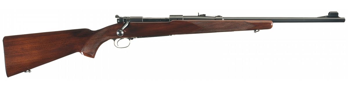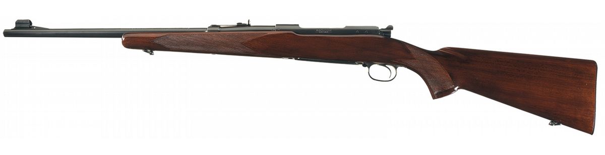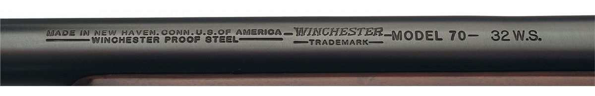 Manufactured in 1941 (receiver). This carbine is chambered in 32 Winchester Special. This caliber is not listed in Dean Whitaker's study, THE MODEL 70 WINCHESTER 1937-1964. The Model 70 was a very popular rifle with many custom variations having been manufactured. Whitaker notes that "the versatility of the rifle gave rise to many factory-sponsored or factory-sanctioned experimental chamberings and configurations." Factory records are, as Whitaker states, "rather scanty or, in some cases, non-existent." Even today there could still be undocumented variations of the Model 70. Hooded ramp front sight and elevation adjustable rear sight on a barrel marked with the Winchester legend followed by "32 W.S." on the left side. The Winchester factory oval proof is stamped on the left side of the barrel and receiver at the breech. The receiver is tapped for scope mounting at the front and sight mounting on the left rear side. Pre-war safety, polished bolt numbered to gun, cloverleaf receiver tang and sling swivels. The straight comb pistol grip stock features checkering and is fitted with a checkered steel buttplate.
