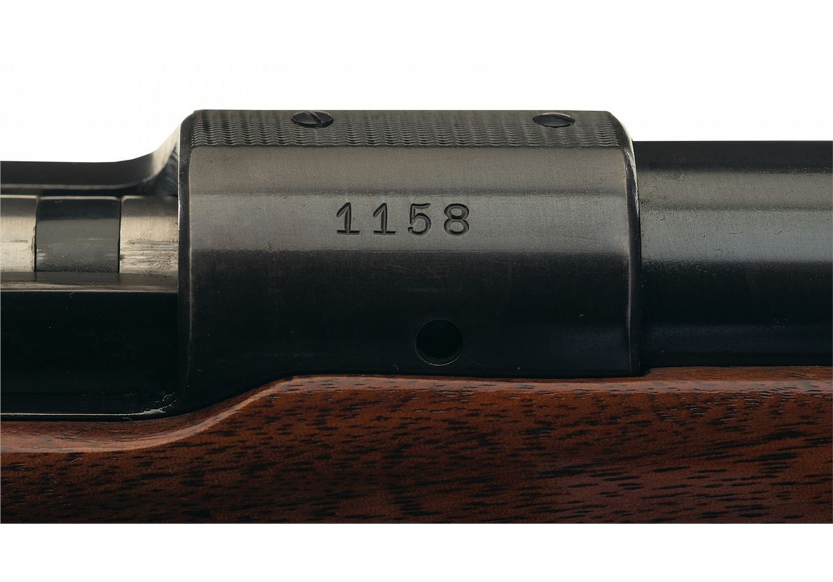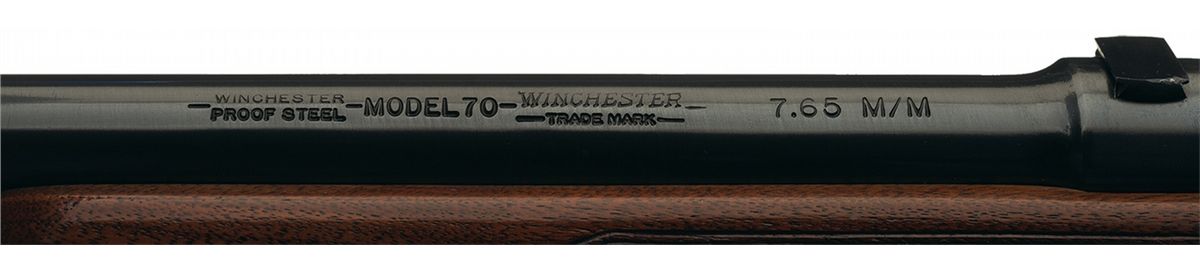Manufactured in 1936 (receiver). The carbine is chambered in 7.65 Argentine. It is believed that Model 70 carbines in 7.65 mm Argentine were produced in very small numbers on a special order basis only. Hooded ramp front sight, filler block in the rear sight slot and Lyman receiver sight (stock inlet). The pre-war type receiver is tapped for scope mounting at the front and has a cloverleaf tang. Pre-war safety, polished bolt, solid bolt knob and sling swivels. Winchester factory style oval proofs on the barrel and receiver. The high comb pistol grip stock features checkering and a checkered steel buttplate.