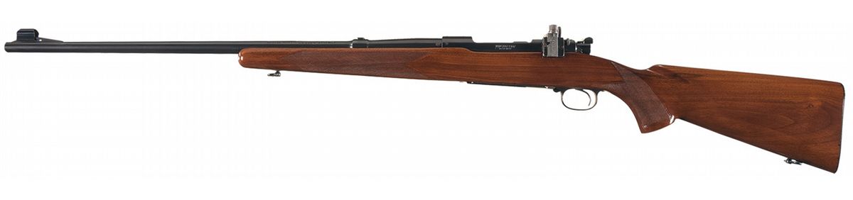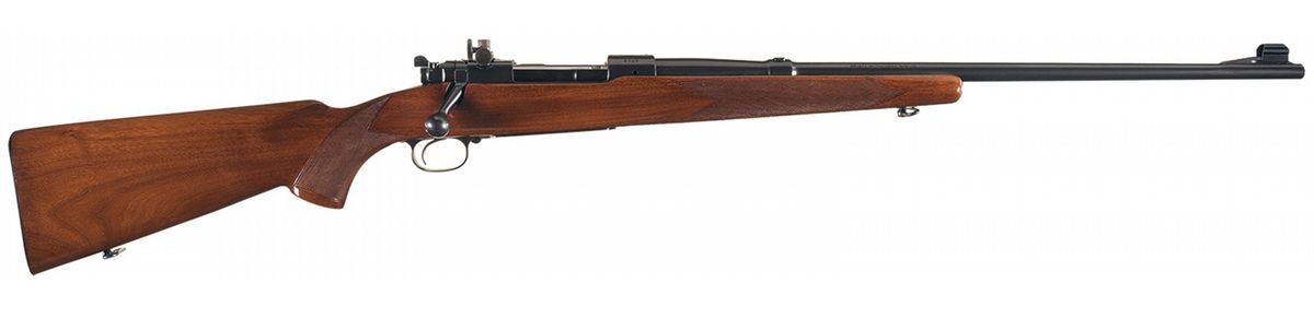 Manufactured in 1937 (receiver). The rifle is chambered in 25-35 WCF, a caliber reported as a non-standard chambering for the Model 70. According to Model 70 expert and author Dean Whitaker, reported non-standard chamberings such as 25-35 WCF are believed to have been "for experimental purposes or to special order" with "very few" sold to the public. Hooded ramp front sight and filler block in the rear sight dovetail slot on a barrel marked with the Winchester legend on the left side and two line address on the right side. The receiver is tapped for scope mounting at the front and fitted with a Lyman sight (stock inletted). Winchester factory style oval proof stamped on the left side of the barrel and receiver at the breech. Pre-war safety, polished bolt numbered to gun, cloverleaf receiver tang and sling swivels. The straight comb pistol grip stock features checkering and a checkered steel buttplate.