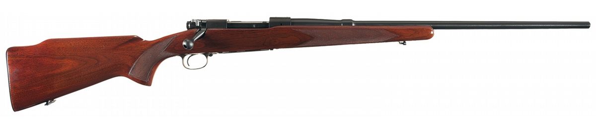 Manufactured in 1961. The barrel was manufactured without sights and is marked with the Winchester legend on the left side. The Winchester proof is stamped on the barrel and receiver at the breech. Receiver is tapped for scope/sight mounting, straight receiver tang, late safety, sling swivels and polished bolt numbered to gun. Checkered high comb pistol grip stock is fitted with a checkered metal buttplate.
