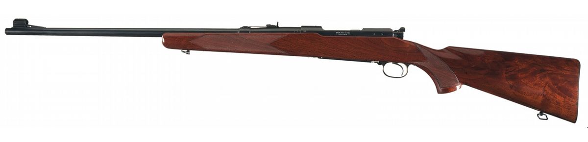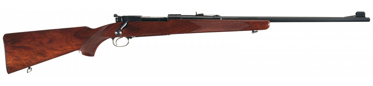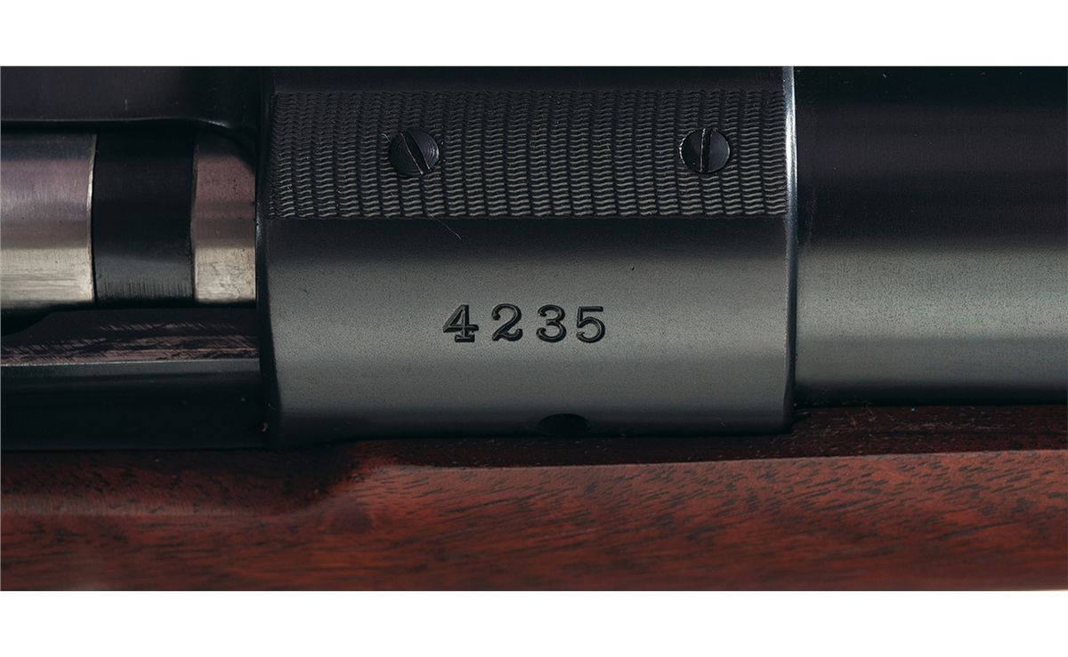 This Winchester Model 70 rifle is chambered in 7.65 mm Argentine caliber and was manufactured in 1937 (receiver), the only year Winchester offered Model 70s in 7.65 mm Argentine. The barrel features a hooded ramp front sight and an elevation adjustable rear sight with the Winchester legend on the left side and two line address on the right side. A Winchester factory oval proof is stamped on the left side of the barrel and receiver at the breech. The pre-war receiver is tapped for scope mounting at the front and tapped for sight mounting on the left rear. Pre-war safety, polished bolt numbered to gun, solid bolt handle knob, blue bolt handle and extractor and polished follower. The nicely figured straight comb pistol grip stock features checkering, sling swivels and checkered steel buttplate.