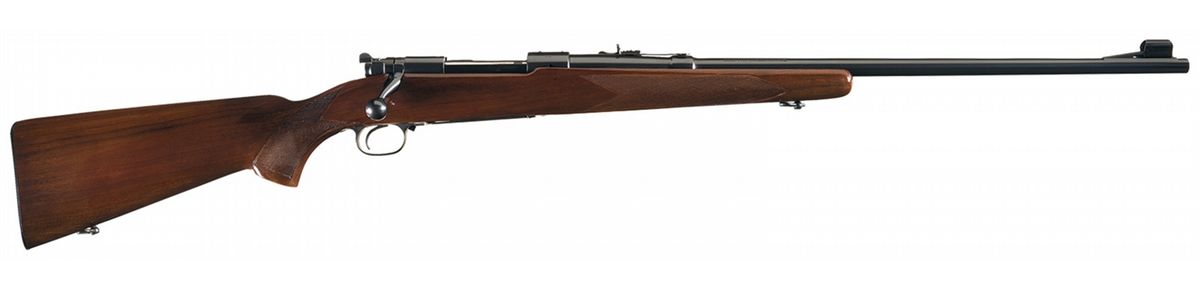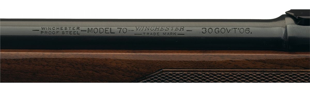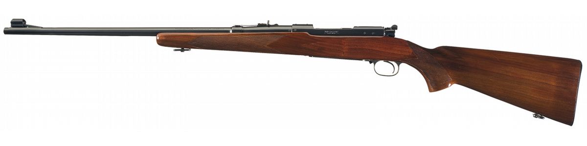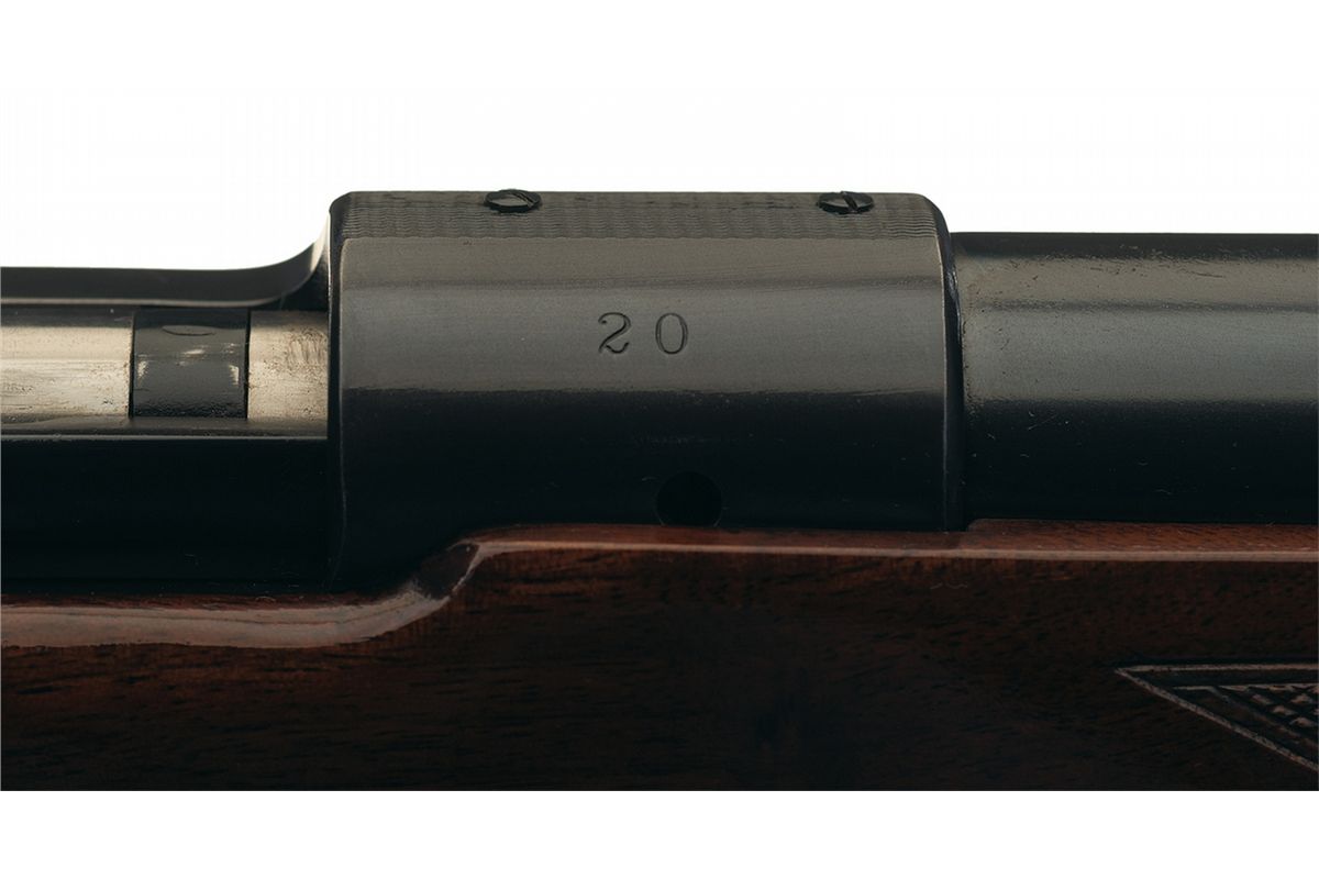 Manufactured in 1936 (receiver) and subsequently restored many years later. Hooded ramp front sight and elevation adjustable rear sight on a barrel with the Winchester legend on the left side and two line address on the right. The pre-war type receiver is tapped for scope mounting at the front and sight mounting on the rear left side. Pre-war safety, cloverleaf receiver tang, polished bolt numbered to gun and sling swivels. A serial number 20 restored Winchester factory style oval proof is stamped on the left side of the barrel and receiver at the breech. The straight comb pistol grip stock features checkering and a checkered steel buttplate.