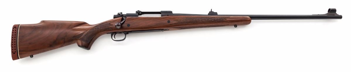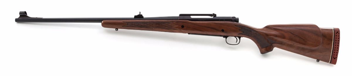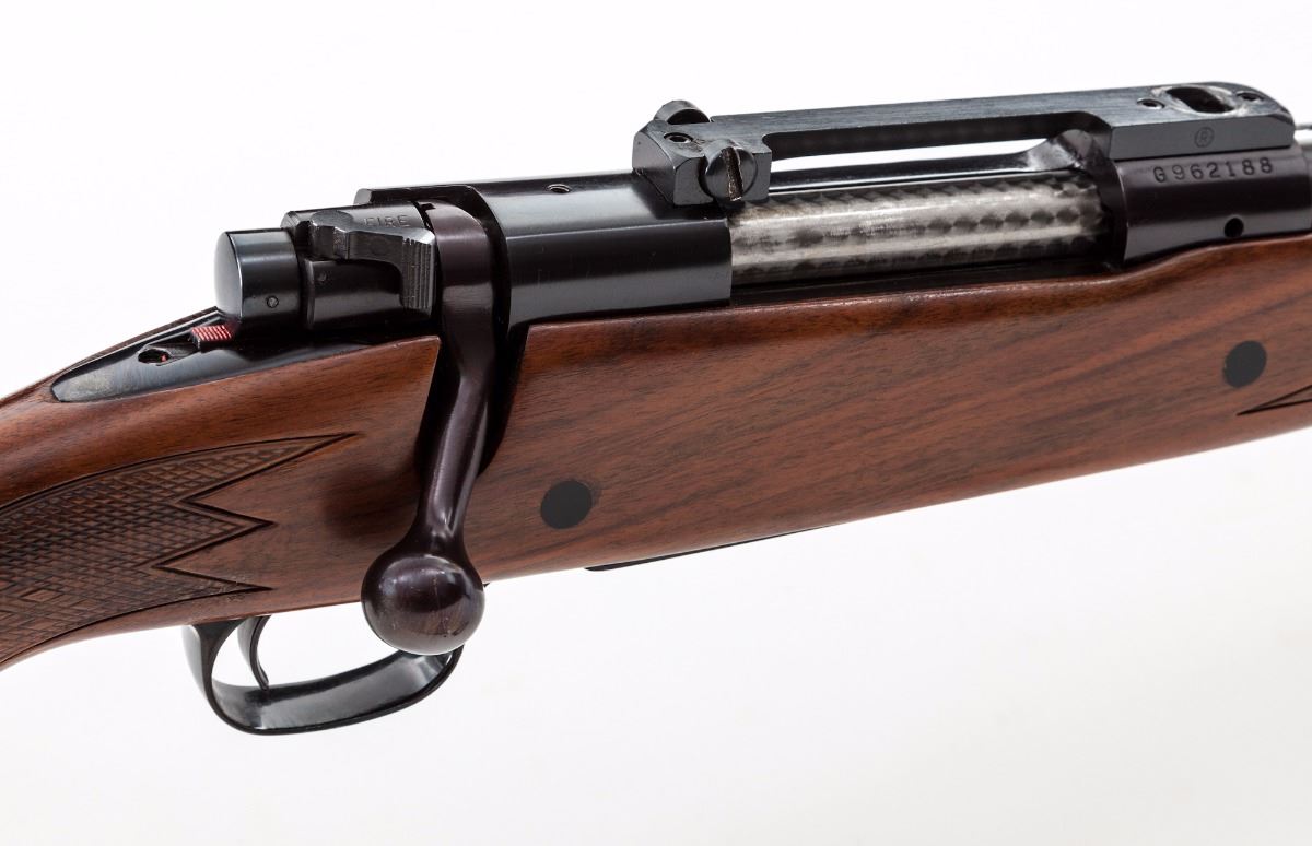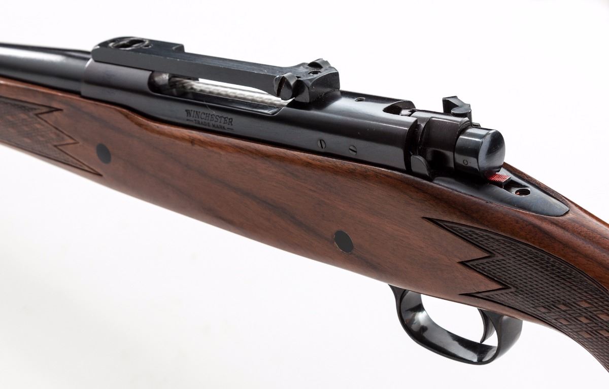 Winchester Model 70 Bolt Action Rifle, #G962188, .338 Win. mag. cal., 24'' barrel, blue finish, uniquely checkered pistol-grip walnut stock and forend with cheekpiece, checkering with additional diamond pattern, as well as added designs just behind pistol grip; decorative black metal grip cap, Winchester red rubber recoil pad, jeweled bolt, hooded silver bead front sight, notched adjustable rear sight, and Redfield scope base. Mfg'd 1971. Condition is excellent retaining approx. 98% blue with some fine micro-scratching. Stock with scattered fine impressions and other small marks from handling, the most pronounced being to the bottom edge near the rear sling swivel stud. Scope base shows wear from scope removal, as well as some minor deformation to the scope base screws. Action is crisp, bore is excellent with well-defined rifling. Est.: $800-$1,200. (Modern)
