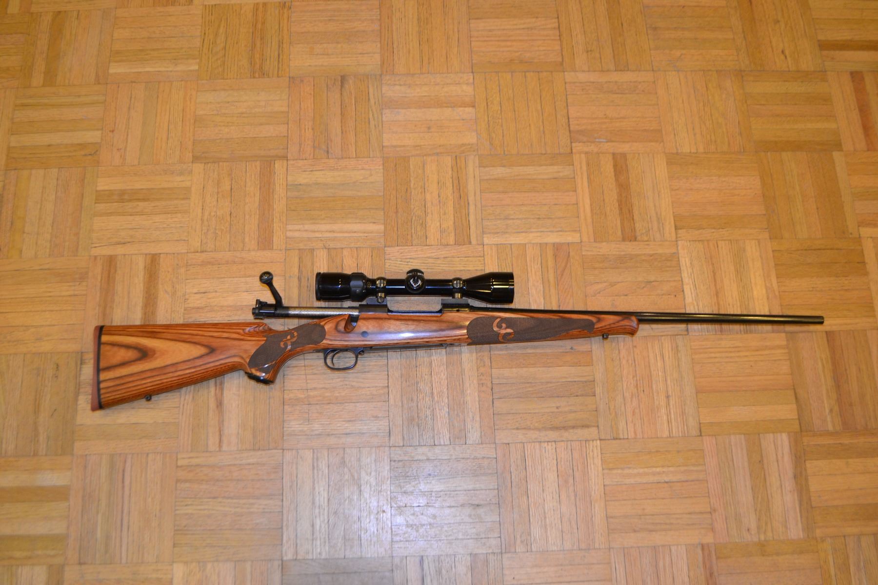 This Winchester Model 70 Featherlight is chambered in .270 and features a beautiful laminate, maple stock. Included is a mounted Bushnell scope.