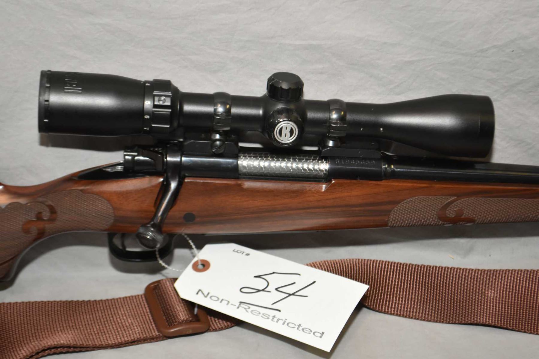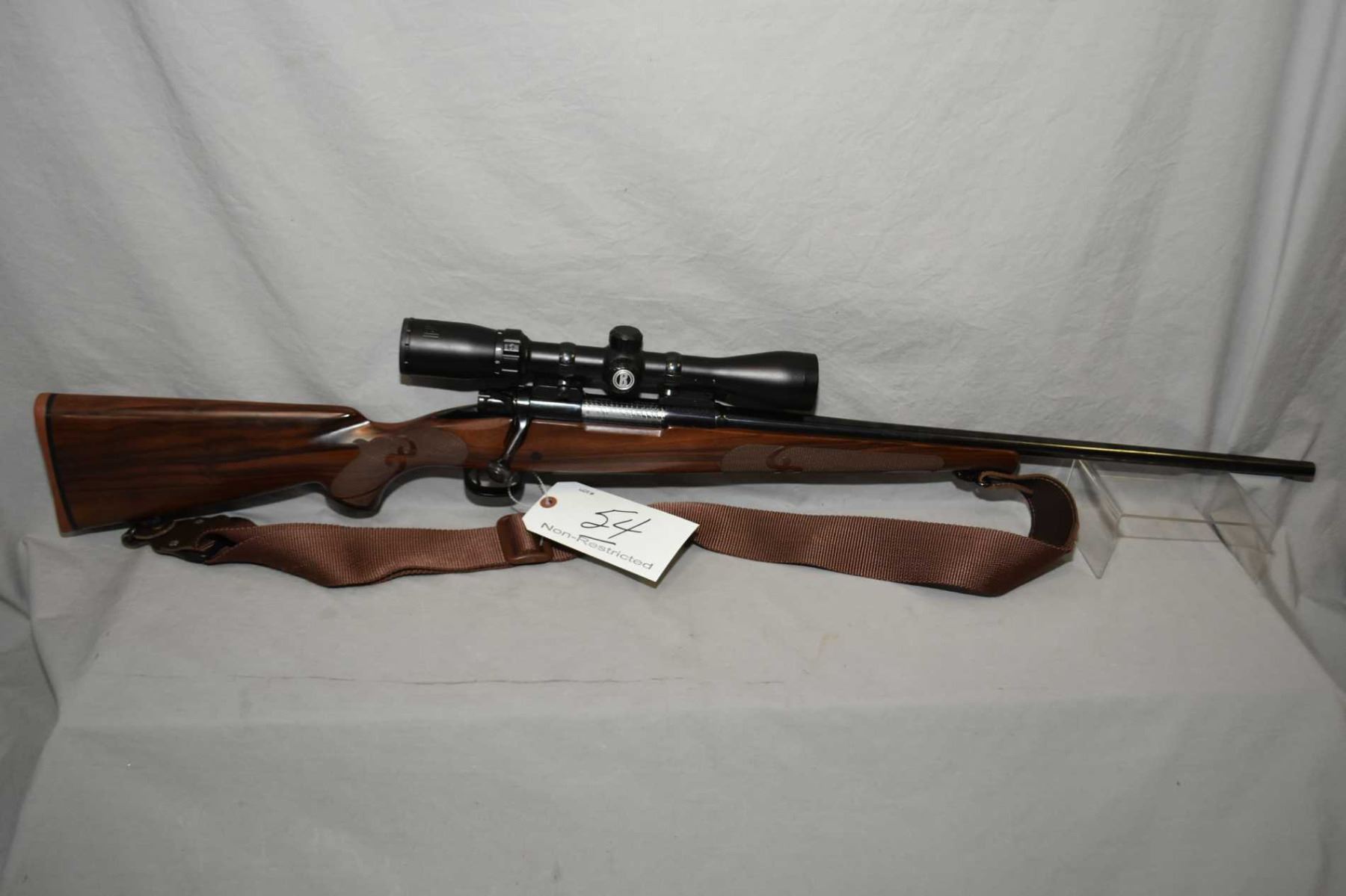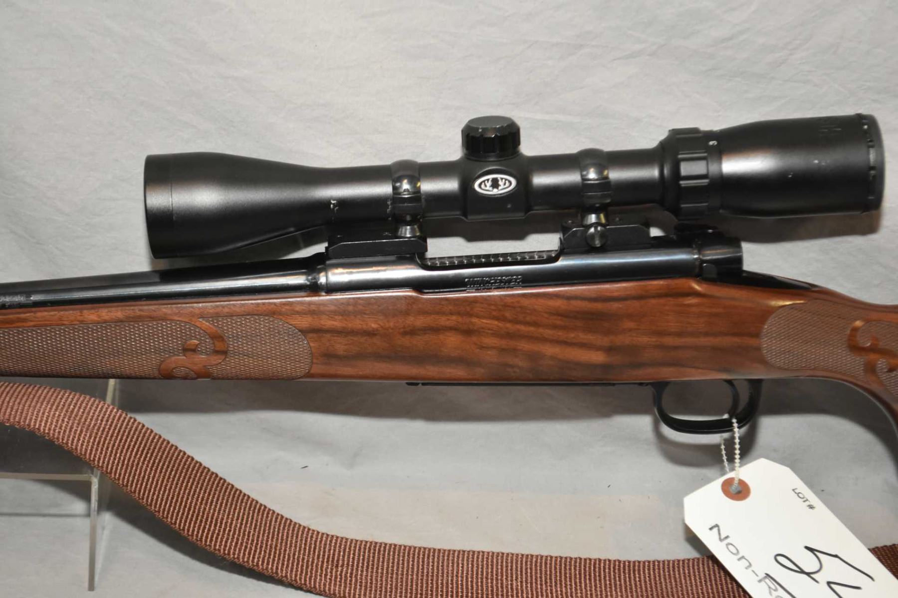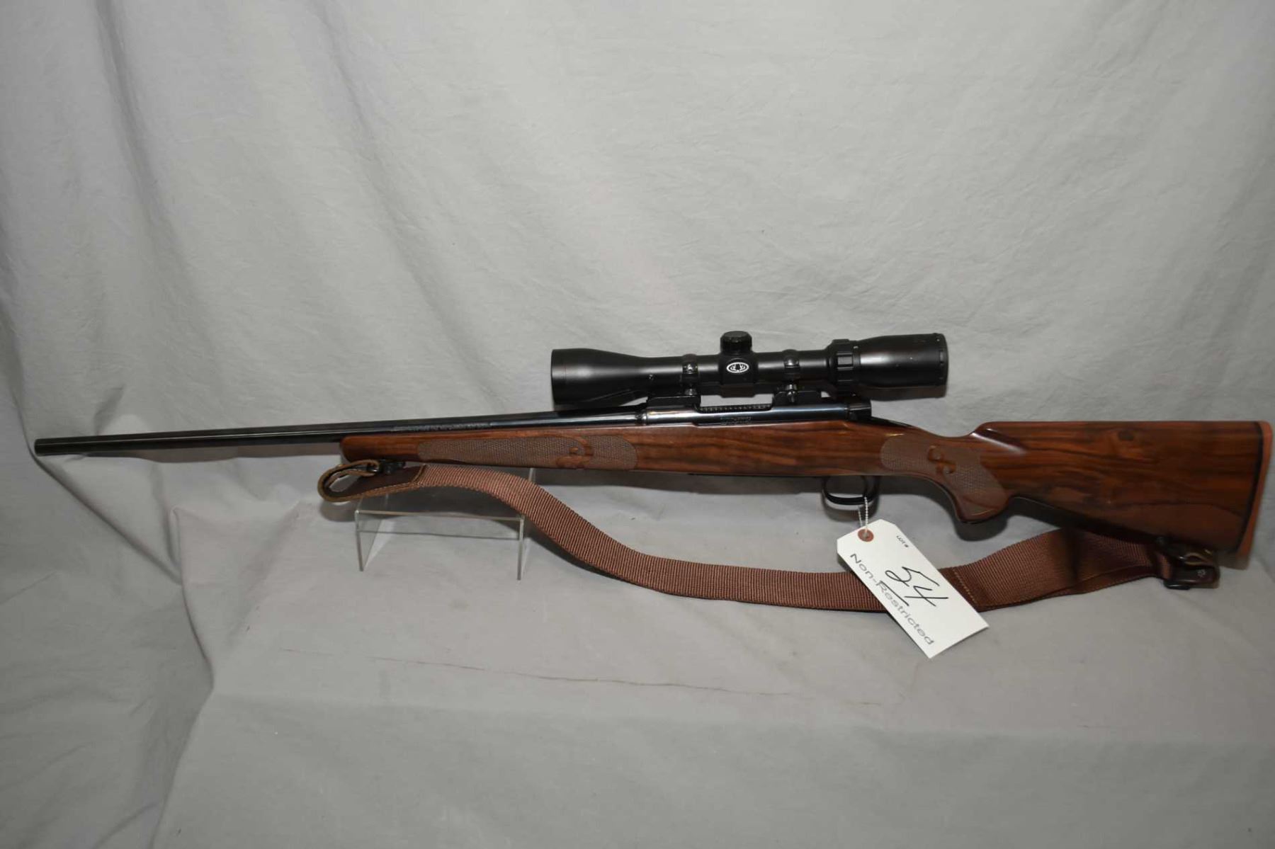 Winchester Model 70 Featherweight .243 Win Cal Bolt Action Rifle w/ 22" bbl [ blued finish, no sights, but fitted w/ Bushnell 3 x 9 Variable scope w/ Redfield rings & bases, fancy checkered pistol grip stock & forend, red Winchester recoil pad, w/ brown nylon & leather sling w/ quick off swivels, few slight marks to scope and wood ] Ser # G1945659