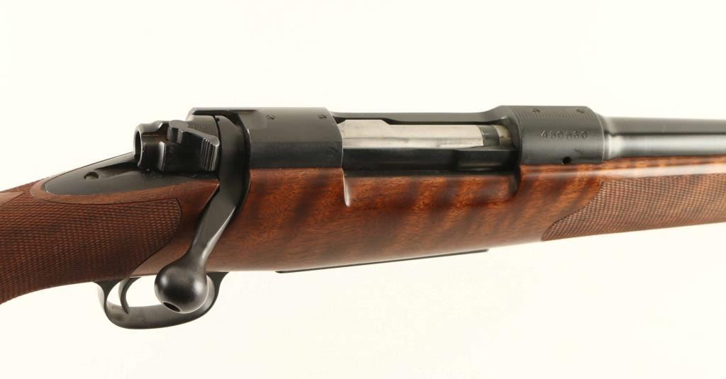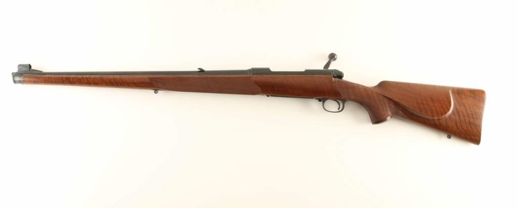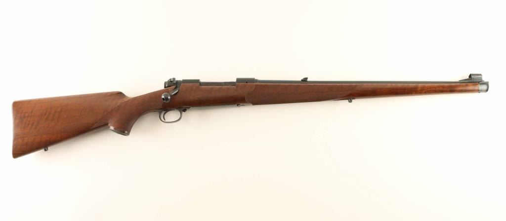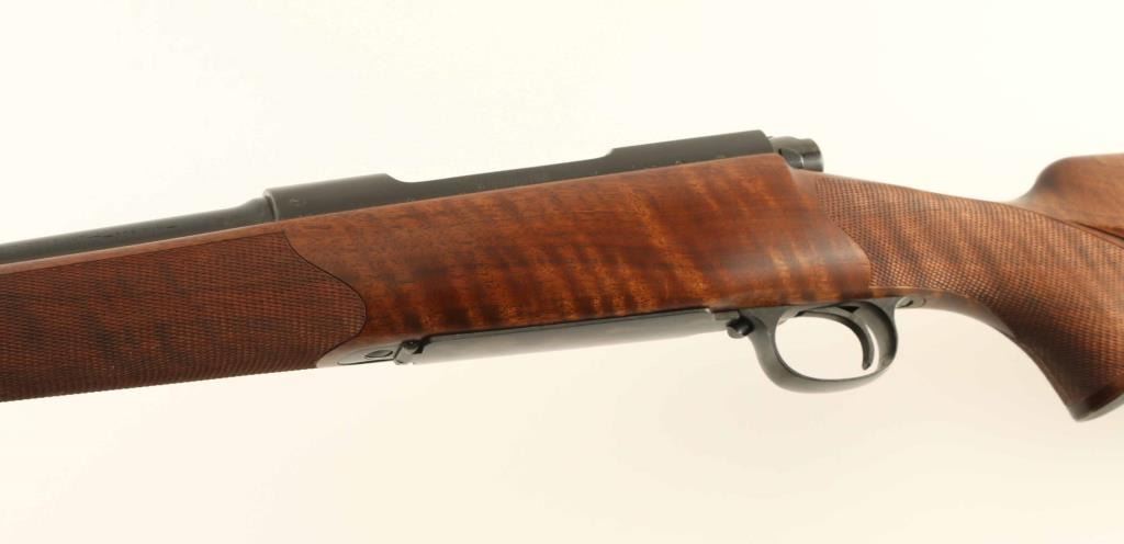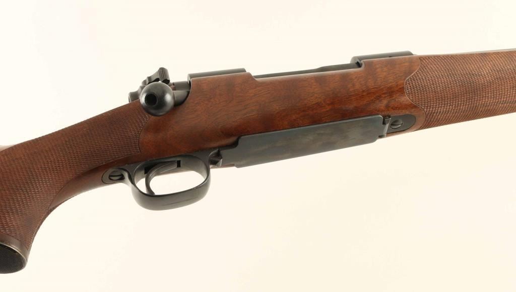 SN: 450560 Bolt action rifle chambered for 308 Winchester, manufactured circa 1959. Features blued finish, approx 22" barrel, hooded front sight ramp, blade front sight with bead top, folding rear sight, hinged floorplate, manual safety, receiver drilled & tapped for scope mounting. Stock is a Mannlicher full length style with blued steel forend cap at muzzle, right hand Monte Carlo cheek piece, checkered & blued steel buttplate & grip cap, sling swivel studs, checkered panels at sides of wrist and forend. Bore is excellent. Finish on metal parts is 98% with small areas of bare metal at forend cap, grip cap and buttplate, handling marks on bolt. Stock is excellent with tiny chip or gouge at stock toe next to buttplate. Condition is NRA Excellent ***C&R Firearm*** [From the Jim Wilkinson Rifle Ranch Collection]