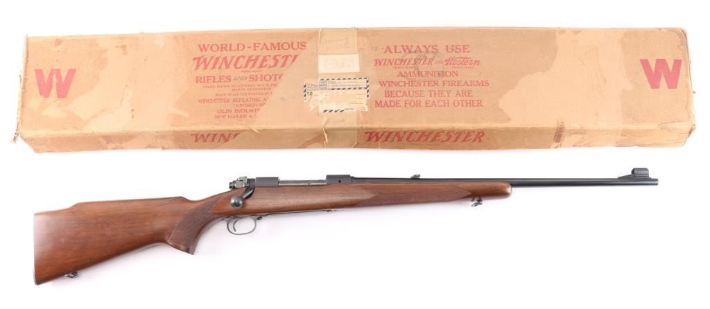 SN: 233868. Bolt-Action. Model 70 "Featherweight" Pre-64, manufactured in 1951. 22" round, tapered barrel with ramped, hooded, post/bead front and flip u-notch, "white triangle" rear sights. Mauser style action. Anodized matte-black receiver, drilled/tapped for optics. Blued barrel, and trigger assembly, 3-position manual safety, hinged floorplate, Checkered high comb pistol grip stock with sling swivels. Checkered aluminum butt plate. Wood is excellent, bore is excellent/bright. Action is smooth/tight. Markings are crisp/clear. Winchester proofs on receiver/barrel. Finish is excellent. Rifle is in new condition. Comes with original factory box with matching label, instructions and tags. Box is in poor condition.