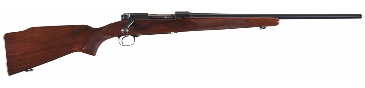 Manufactured in 1953 (receiver). The barrel was manufactured without sight and is marked with the Winchester legend on the left side. The Winchester factory oval proof is stamped on the left side of the barrel and receiver at the breech. Receiver tapped for scope/sight mounting, late safety, straight receiver tang and polished bolt numbered to the gun. The high comb pistol grip stock features checkering, sling swivels and a checkered aluminum buttplate.