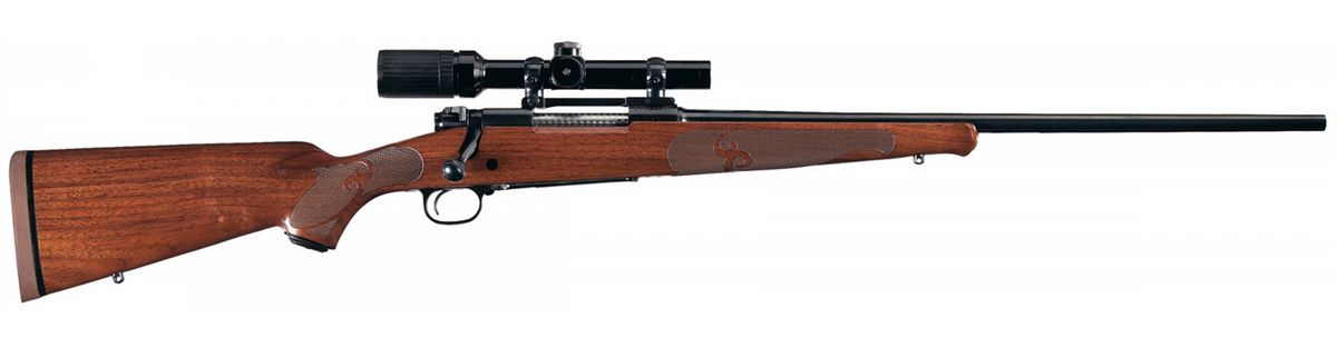 Manufactured between 1981-1985. No sights with Bausch & Lomb 1.5x6X scope mounted. Standard markings on the left side of the barrel. Fancy checkered pistol grip stock with Schnabel forearm, sling studs, raised comb and Pachmayr solid rubber recoil pad.