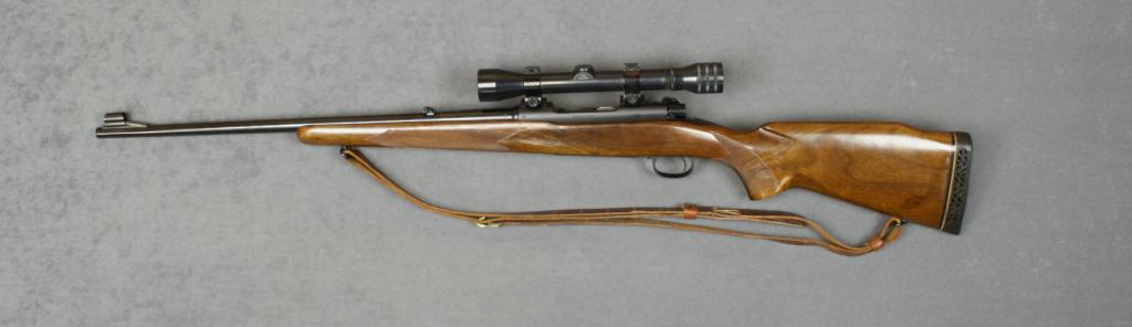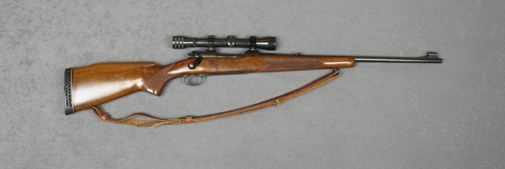 Winchester Model 70 Featherweight bolt-action rifle, .243 Win. cal., 22” barrel, blue finish, checkered wood stock, leather sling, mounted with a Bear Cub 4X scope, #448526. This gun is in overall fine condition showing the majority of its original finish, fine bore, action, markings and wood stock with scattered nicks and mars from carry and storage; added White Line hard rubber butt pad; clear scope optics. Est.: $500-$1,000.