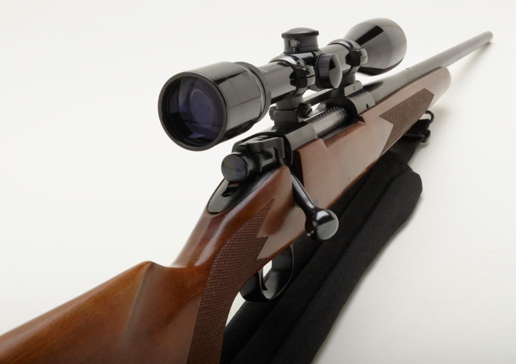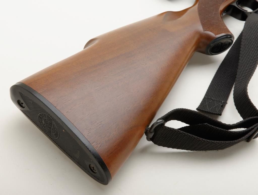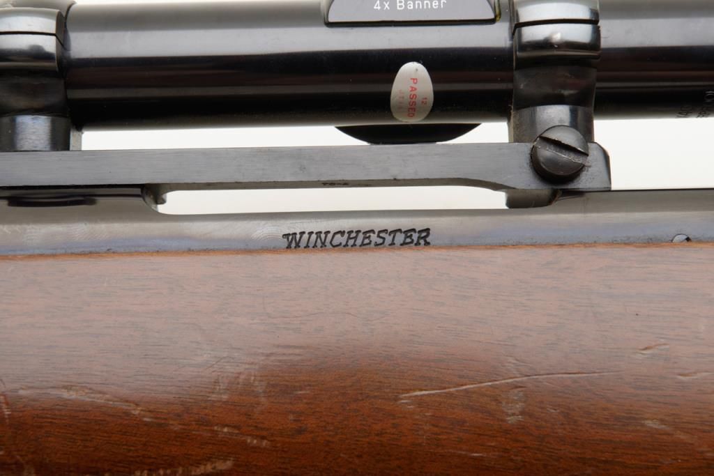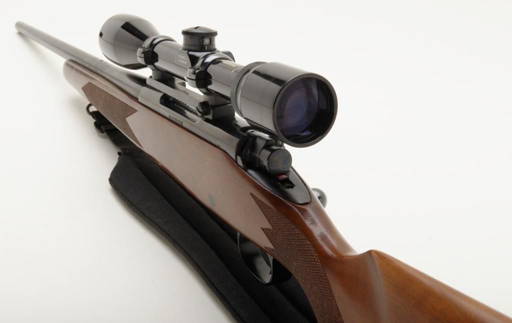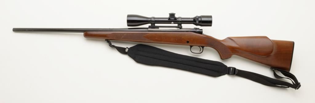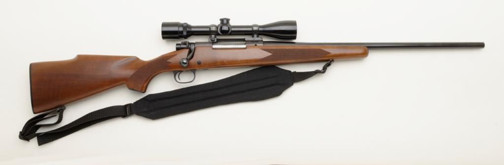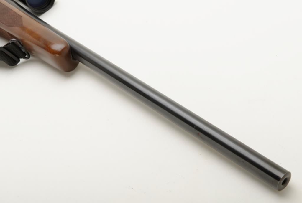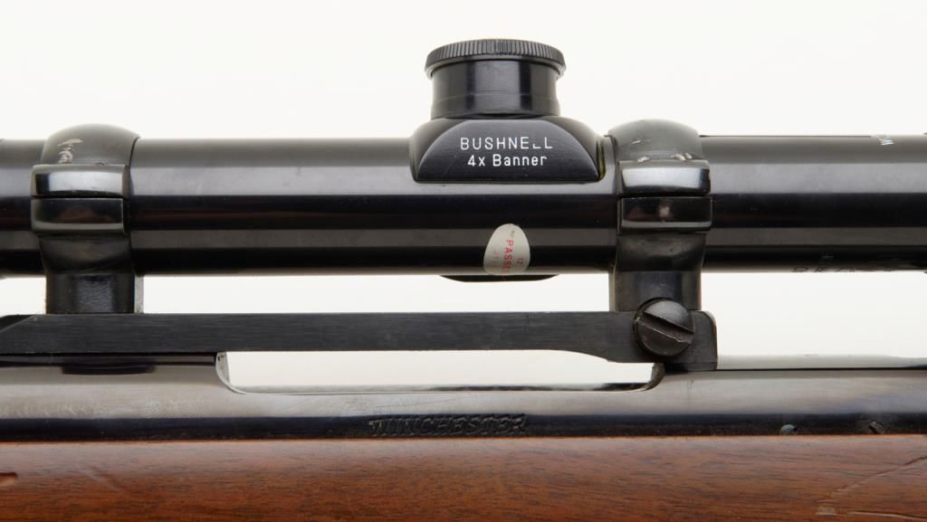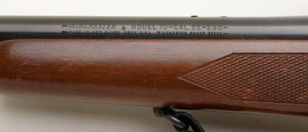 Winchester Model 70, G series, post 1964 in .22-250 caliber, 22” barrel mounted with 4x power Bushnell scope in very good plus condition, serial number G1068136. The front sight ramp has been removed and there are some scratches on the end of the barrel and a couple of extra tap holes at the middle of the barrel for mounting the rear sight that has been removed. The stock shows a couple of scratches. A fabric sling has been included. The bore is fine to near excellent with just a little use. Est.: $250-$500