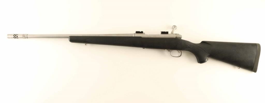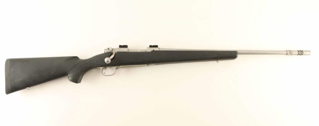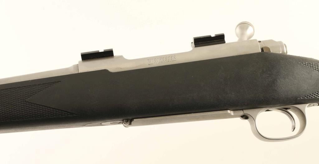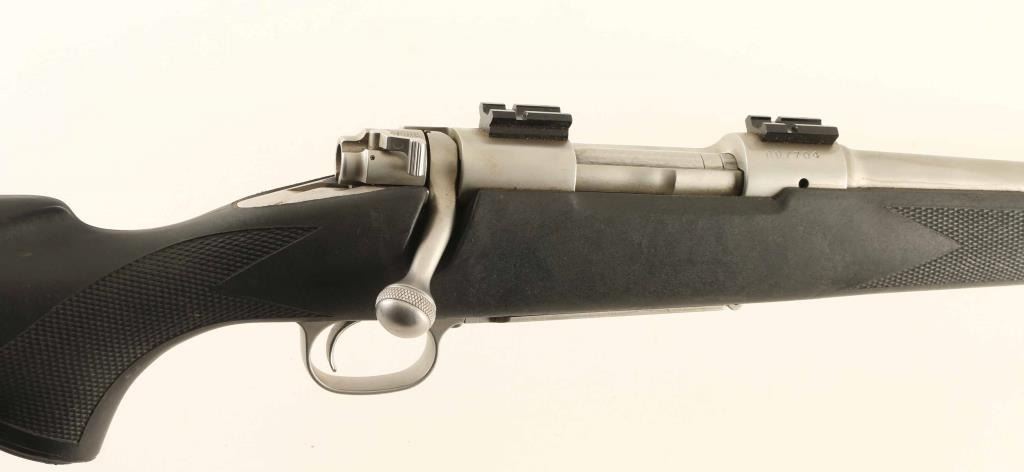 'Classic Stainless BOSS' American made control round feed stainless steel bolt-action sporting rifle chambered in .243 Winchester. Features a satin finish, 19.75" barrel with adjustable Ballistic Optimizing Shooting System & no provisions for sights, installed two-piece scope base, jeweled bolt, manual three-position safety, serrated trigger, internal box magazine with hinged floorplate, and checkered black synthetic pistol grip shoulder stock with swivel studs & factory recoil pad. Rifle exhibits light handling wear. Action is smooth, bore is excellent, and the synthetic stock is fine. Condition is NRA near excellent. ***Modern Firearm***