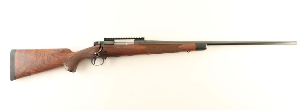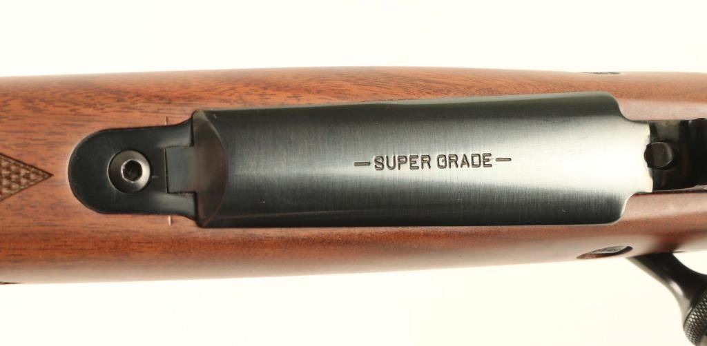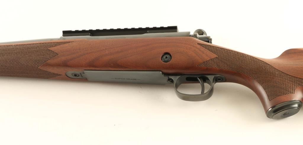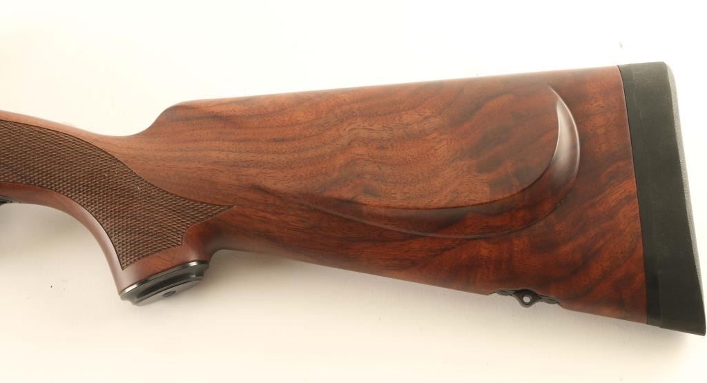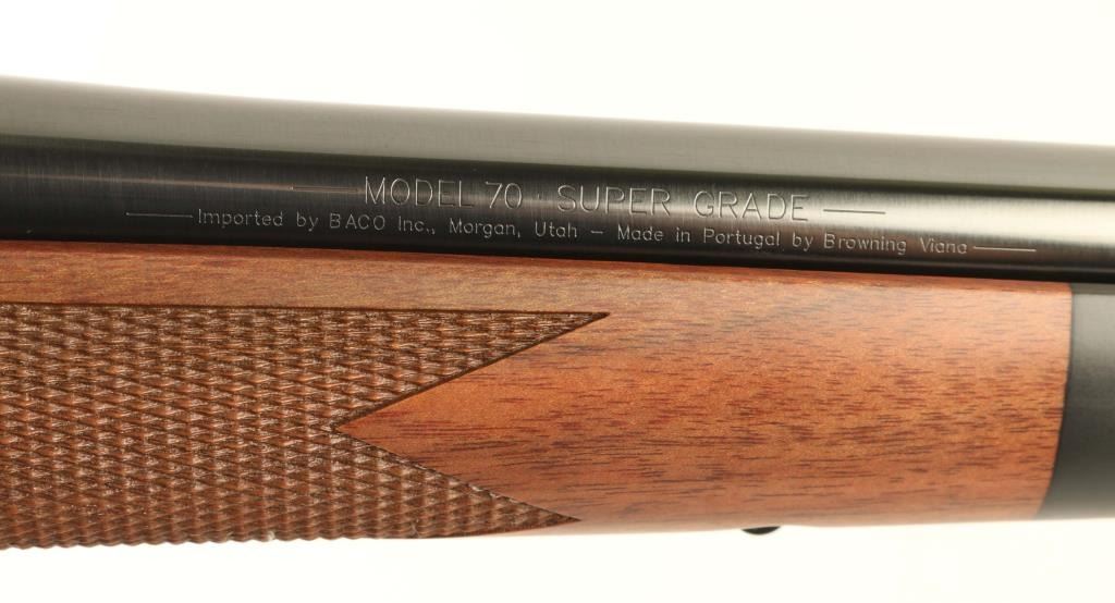 SN: 35GZR11449 High grade control round feed bolt action sporting rifle chambered in .338 Winchester Magnum, manufactured in Portugal by Browning Viana. Imported by BACO Inc. of Morgan, Utah with import stamp on the right side of the barrel. Features a lustrous blued finish, 26" tapered barrel with recessed target crown & no provisions for sights, installed one-piece Warne 20 MOA aluminum scope rail, adjustable Timney trigger with serrated bow, machine turned bolt with swept-back handle, three-position safety on the rear of the bolt, 3 round internal box magazine with hinged floorplate, and point checkered grade V fancy walnut semi-pistol grip shoulder stock with matte finish, ebony forend tip, steel grip cap, right handed shadowline cheek piece, inletted swivel studs, decorated crossbolt, Decelerator recoil pad & 13.75” LOP. Includes the original factory cardboard box. Rifle retains approximately 99%+ of its original high polish blued finish showing light to no visible wear. Action is very smooth, the bore is pristine, and the nicely figured wood stock is extra fine. Condition is like NRA Perfect. ***Modern Firearm***