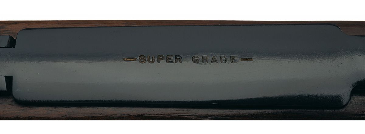 Manufactured in 1967. Hooded ramp front sight and adjustable leaf rear sight with a tapped hole ahead of the rear sight on a barrel marked with the Winchester Super Grade legend on the left side. The Winchester factory oval proof is stamped on top of the barrel and receiver. The floor plate is marked "-SUPER GRADE-". Jewelled bolt numbered to gun. The high comb pistol grip stock features multi-point checkering, ebony forend cap, metal red "W" grip cap, cheekpiece, engraved bolt heads, sling swivel studs and vented Winchester recoil pad.