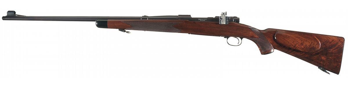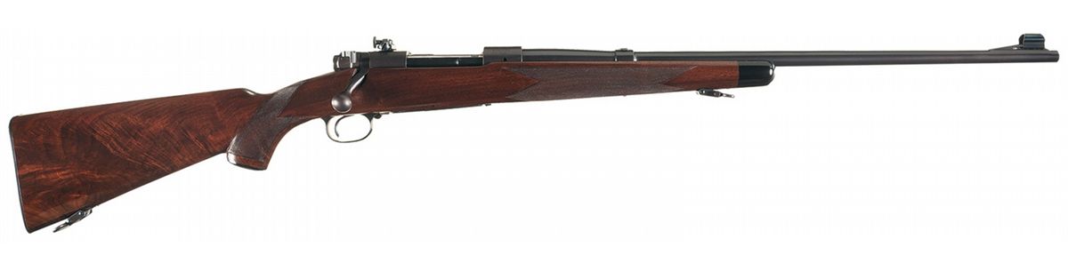 Manufactured in 1950 (receiver) during the transition period (late 1945-1951). Hooded ramp front sight and filler block in the rear sight dovetail slot on a barrel with the Winchester legend on the left side. The receiver has a Lyman sight and is tapped for scope mounting. Winchester factory oval proof on the barrel and receiver. Polished bolt numbered to gun, quick release sling swivels and straight receiver tang. Nicely figured straight comb pistol grip stock featuring checkering, ebony forend tip, Winchester hard rubber grip cap, cheekpiece and checkered steel buttplate.