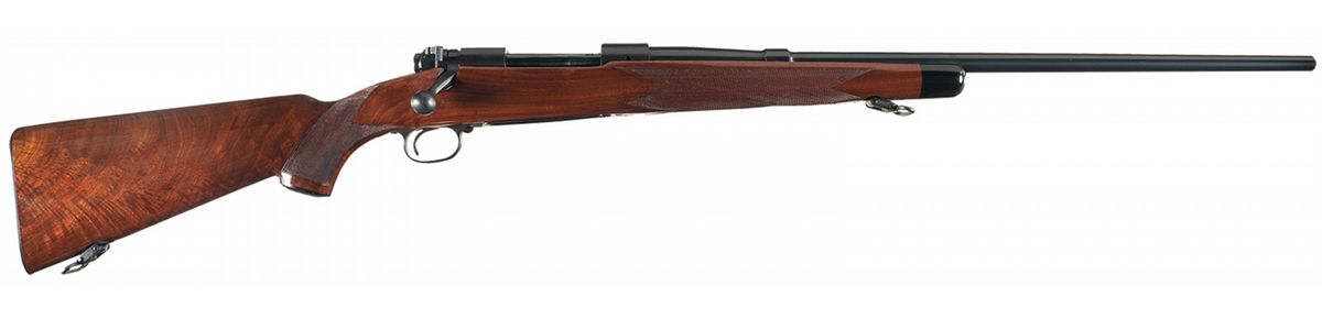 Manufactured in 1949 (receiver) during the transition period (late 1945 to 1951). The barrel is manufactured without sights and is marked with the Winchester legend on the left side. The receiver is tapped for scope/sight mounting. The floor plate is marked "-SUPER GRADE-" and a Winchester factory oval proof is stamped on the barrel and receiver. Late safety, straight receiver tang, polished bolt numbered to gun and quick release sling swivels. The nicely figured straight comb pistol grip stock features multi-point checkering, ebony forend tip, Winchester hard rubber grip cap, cheekpiece and checkered steel buttplate.