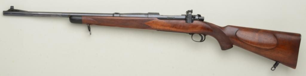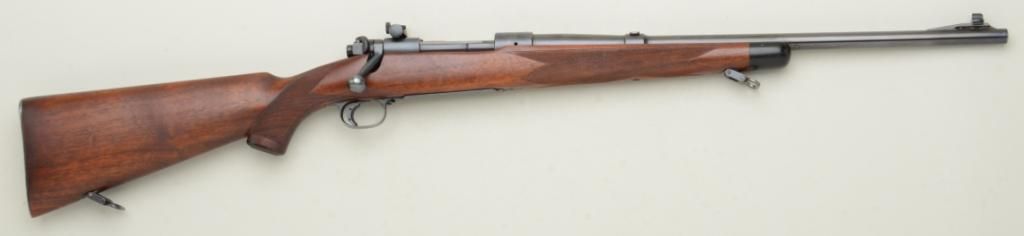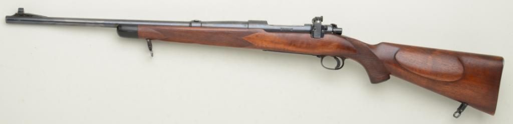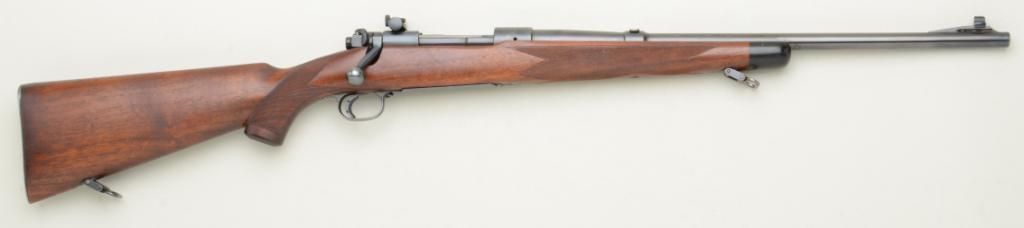 Winchester Model 70 Super Grade bolt-action rifle, .22 Hornet cal., 20” round barrel, blue finish, checkered wood stock, Lyman adjustable receiver peep sight and white dot front sight, early #14288. This gun is inoverall very good + to near fine condition showing the majority of its finish, fine bore, action, markings and wood stock with checkered steel butt plate and sling swivels; very desirable caliber and a beautiful early Model 70. Est.: $2,500-$4,000.