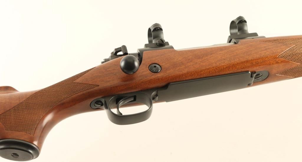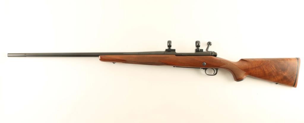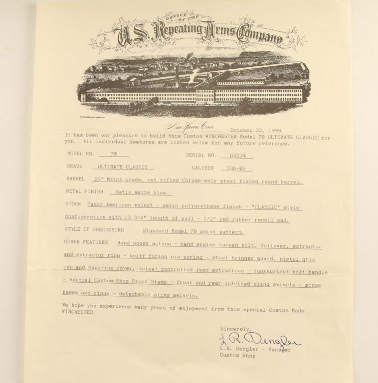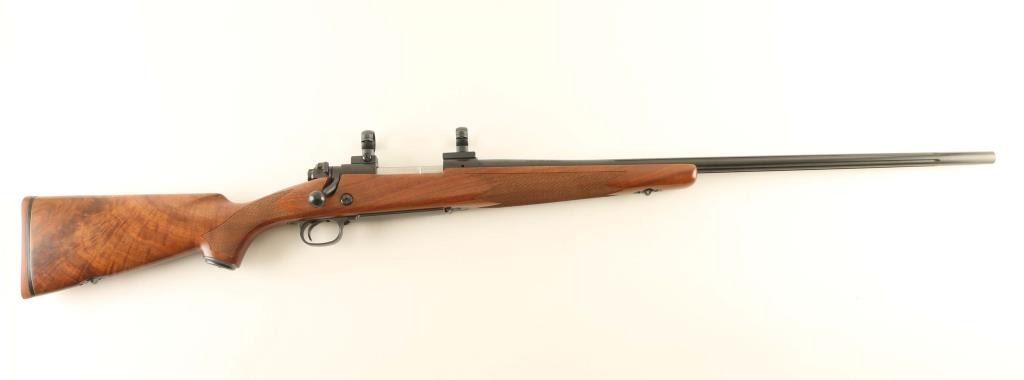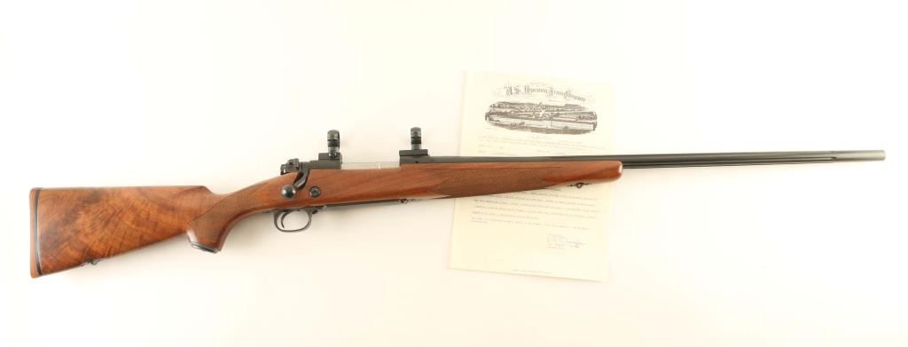 SN: G2234 Special order controlled-round-feed bolt action sporting rifle chambered in .338-06, built by U.S. Repeating Arms Co. in New Haven, CT in 1999. Features a satin matte blued finish, fluted 26” chrome-moly steel match grade barrel with recessed crown & no provisions for sight, installed two-piece scope base with rings, serrated trigger, steel trigger guard, hand honed action, three-position safety on the right side of the bolt shroud, hand engine turned bolt, extractor & extractor ring, swep-back bolt handle with smooth knob, internal box magazine with hand engine turned follower & hinged steel floorplate, Wolff firing pin spring and fancy figured American walnut classic semi-pistol grip shoulder stock with satin polyurethane finish, standard pattern point checkering, inletted sling swivels, steel grip cap, factory red rubber recoil pad & 13 ¾” LOP. Includes a factory letter detailing the various aforementioned attributes, signed by the Custom Shop manager L.R. Dengler. Rifle retains approximately 99%+ of its original finish showing very minor edge wear on the barrel with no other wear observed. Action is very smooth, the bore is pristine and the wood stock is extra fine. Condition is near NRA Perfect. ***Modern Firearm***