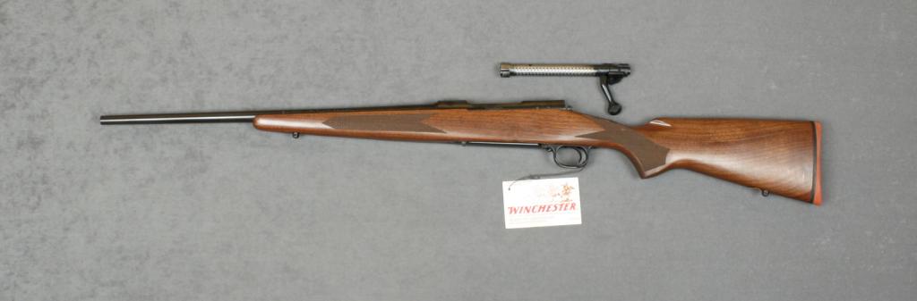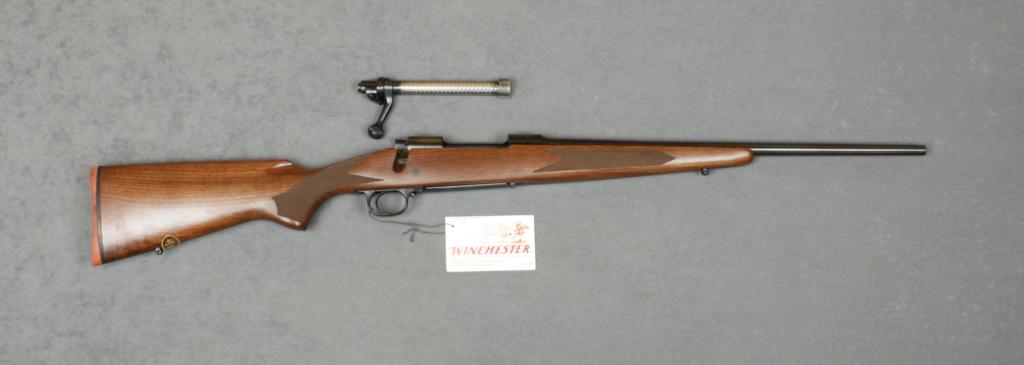 Winchester Model 70 bolt-action carbine,  .30-06 Springfield cal., 20” round barrel,  black finish, checkered wood stocks, sling  swivel eyelets, top of receiver tapped for  scope mount, jeweled bolt, #G1676395. Thisgun is in like new condition with factory  cardboard box.  Est.:  $300-$500.
