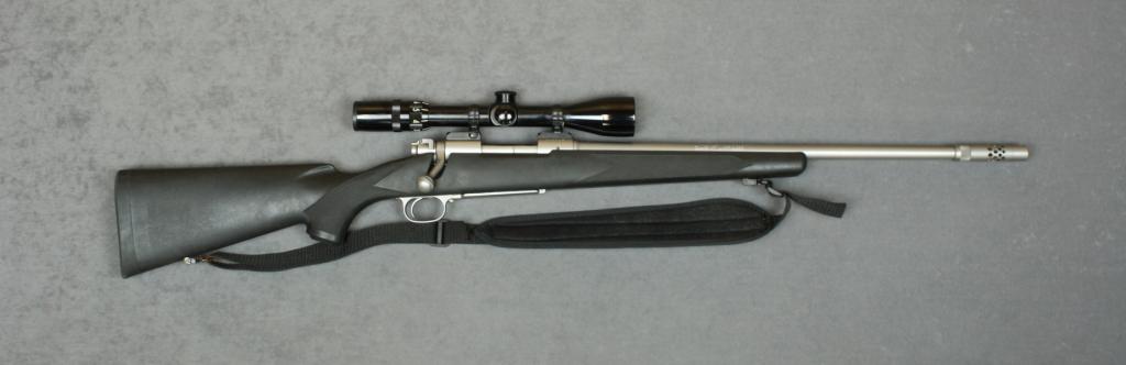 Winchester Model 70 bolt-action rifle,  .22-250 cal., 22” barrel including adjustable  compensator, stainless steel, checkered  composite stock, #G49482. This gun is in  overall excellent condition showing a finebore, crisp action, sharp markings, fine  stock with padded sling and mounted with a  Bushnell 3X-9X Banner scope with fine optics.   Est.:  $800-$1,200.