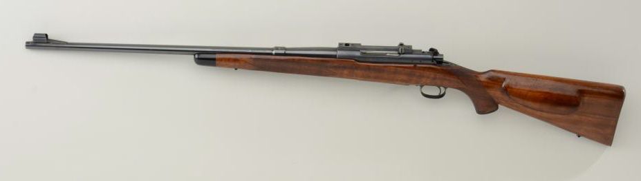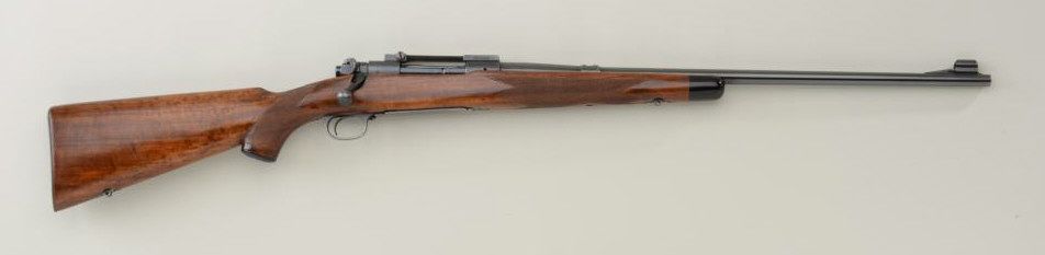Winchester Model 70 bolt-action rifle, .250-3000 Sav. cal., 24” round barrel with Redfield scope base, black finish, checkered wood stock with checkered steel butt plate, #53131. This gun is in overall fine condition showing the majority of its finish, fine bore, action, markings and wood stock that appear to have been re-finished some time ago. Est.: $700-$1,400.