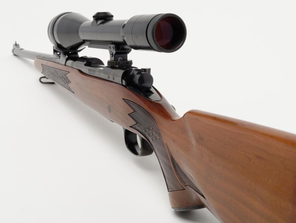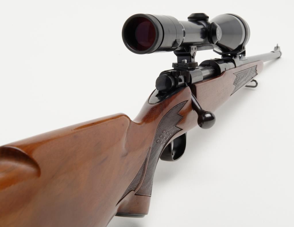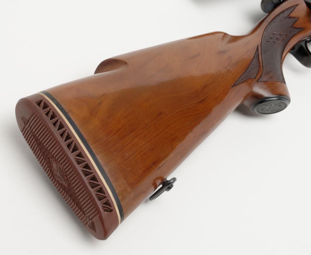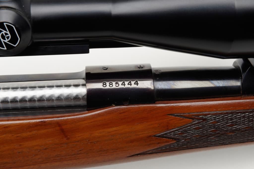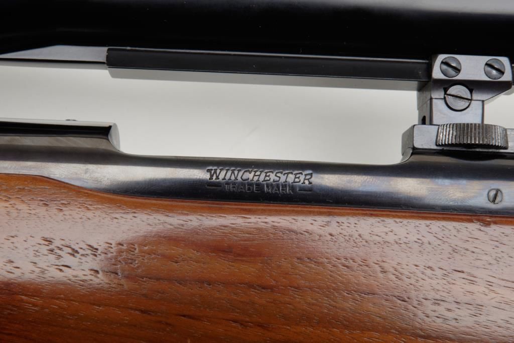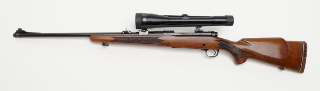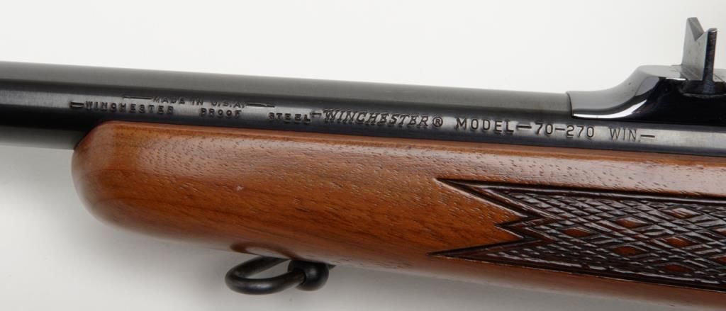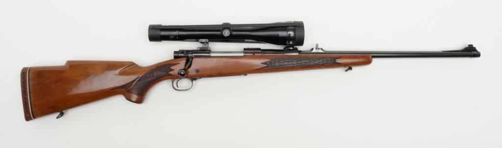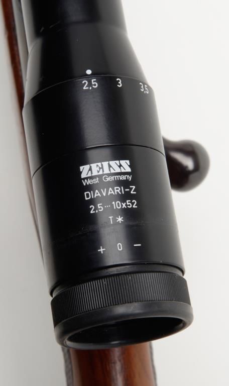 Winchester Model 70 bolt action rifle, .270 Win. cal., 22” round barrel, blue finish, checkered wood stock, sling swivels, red hard rubber butt pad, #885444 with German Q.D. mount that wraps around the barrel and a Zeiss 2.5 x .10X scopedisplaying crisp optics. This rifle is in excellent condition showing little use; approx. 99%+ original finish, fine bore, crisp action, sharp markings and fine wood stock; the mount on this gun would cost about $2,000 to replace andthe scope about $2,500; a really great package in a very popular caliber! (Modern). Est.: $1,000-$2,000