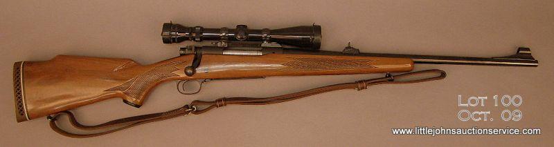 Winchester Model 70 bolt action rifle, 30-06 Springfield caliber, 22" barrel, blue finish, checkered wood stocks, #792439. This gun is in overall excellent condition showing approx. 98% original finish, crisp action, sharp markings,fine bore, hooded front ramp sight, adjustable rear sight and mounted with a Redfield 1" tube 3X-9X scope. The wood stock is very good to excellent with just several mars from storage and handling. Heavy leather adjustable sling included. Est.: $600-$800.