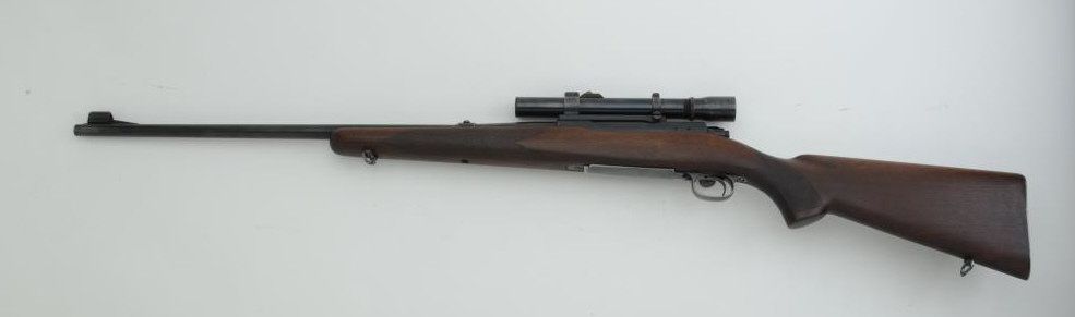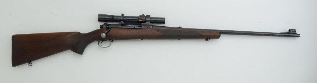 Winchester Model 70 bolt action rifle, .30 Gov’t ’06 cal., 24” barrel, blue finish, hand checkered wood stock, sling swivels, #61998 in overall very good condition showing considerable muted original blue finish, very good to near fine bore, crisp action and markings, very good wood stock; mounted with Redfield scope displaying fine optics. Est.: $500-$1,000.