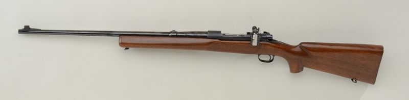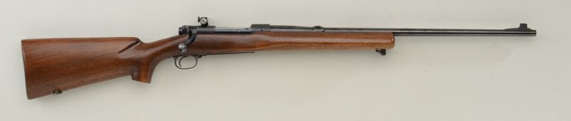 Winchester Model 70 bolt-action rifle with target wood stock and checkered steel butt plate, adjustable front sling swivel, adjustable Lyman rear receiver sight, #374598. This gun is in overall finecondition with fine bore, action, markings and target stock. Est.: $800-$1,600.