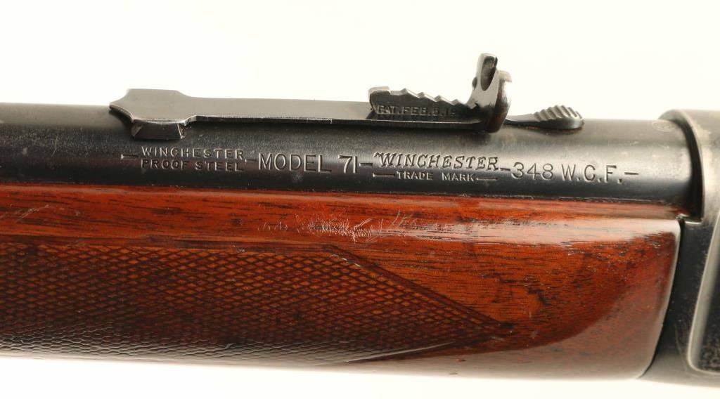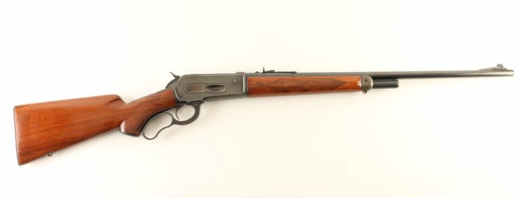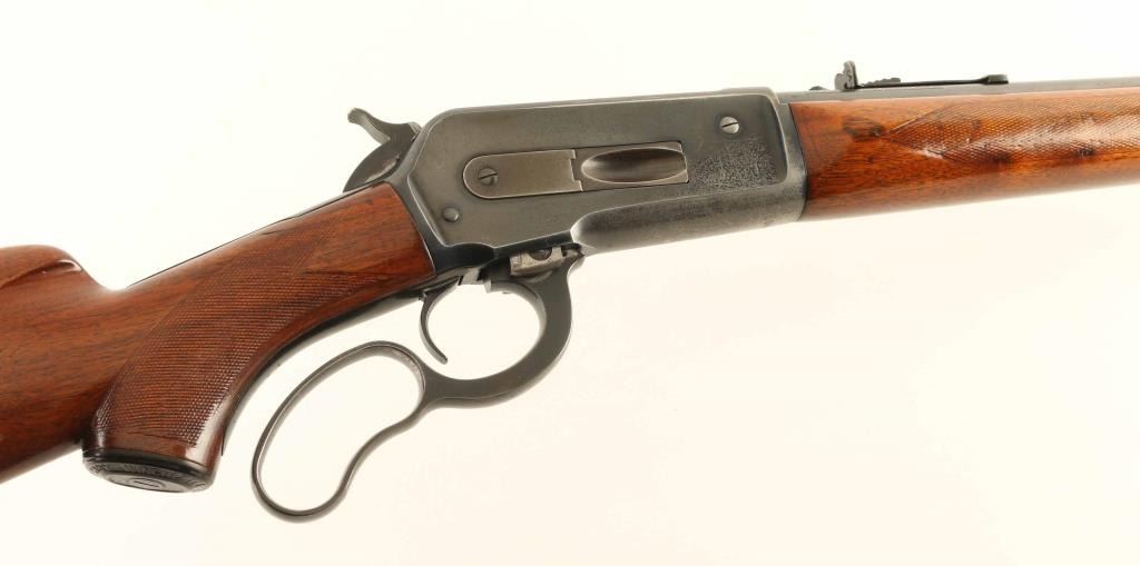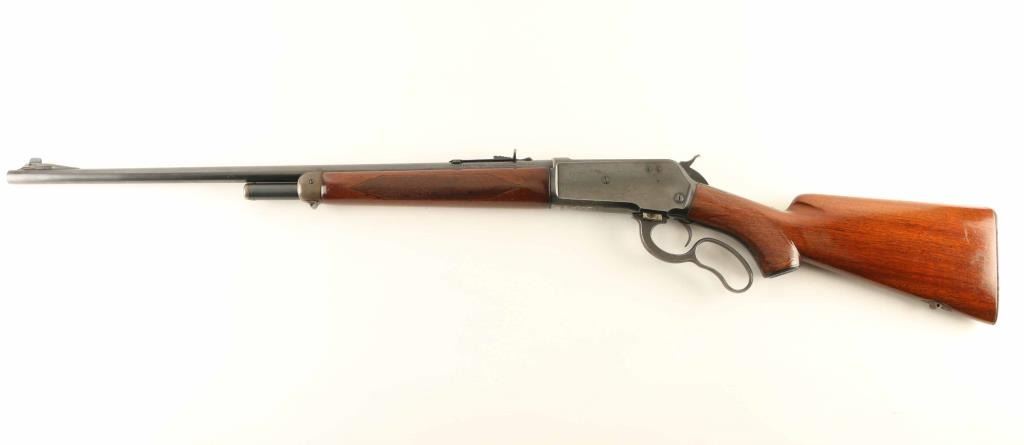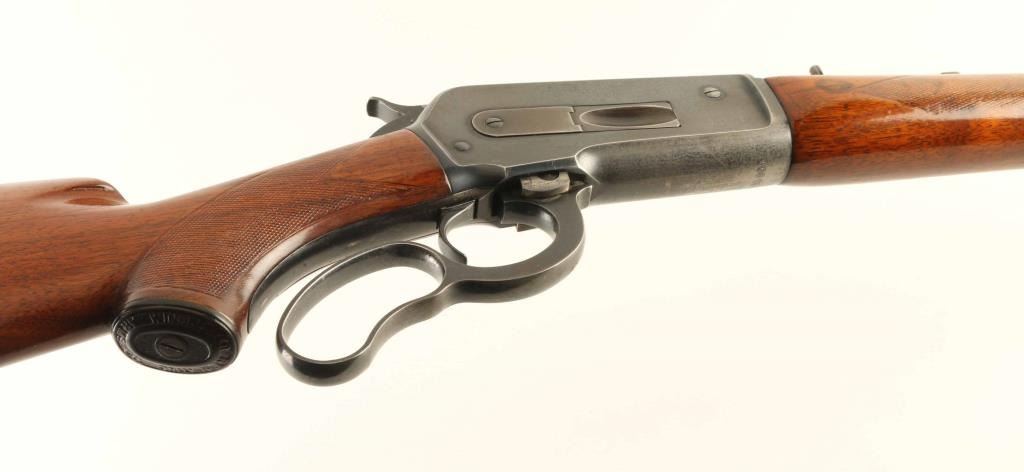 'Deluxe Long Tang Sporting Rifle' manufactured circa 1937. Features 24" barrel, 1/2 length magazine, buckhorn sights, curved pistol grip with plastic grip cap, shotgun butt with checkered steel buttplate, checkered panels at wrist & forend, sling studs. Bore is very good condition. Retains 70% blue, thinning and graying on edges and where handled, especially receiver & lever edges, bottom of receiver, loading gate, and on sides of barrel. Brown color from thin patina or rust at rear swivel stud & buttplate. Screw slots are good with very slight marring. Wood is very good condition with light scuffing and some dents, good fit to metal. Checkering is a bit smooth, showing handling wear. Stock appears revarnished. Operation is smooth. Markings are sharp. Condition is NRA Very Good - varnish added to wood *** C&R Firearm ***