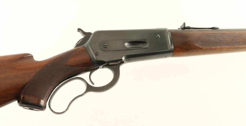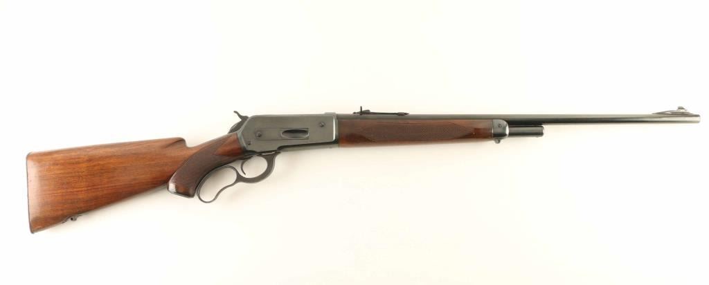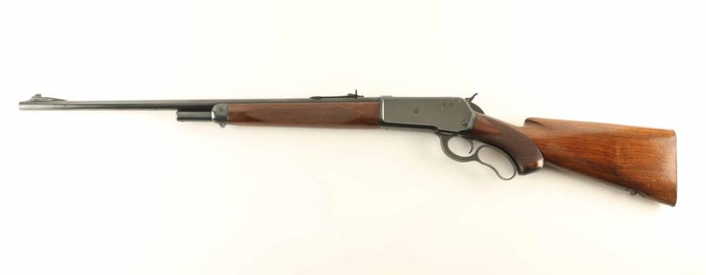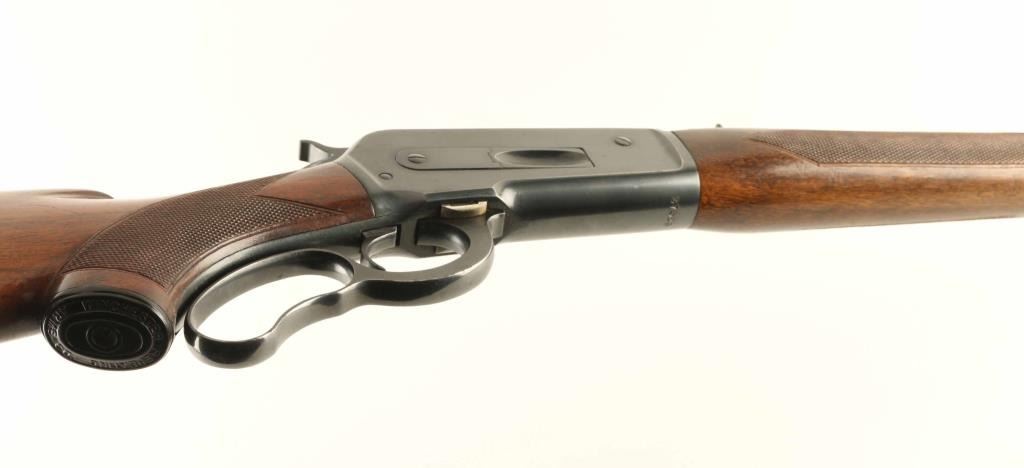'Deluxe Sporting Rifle' manufactured circa 1954. Features 24" barrel, 1/2 length magazine, buckhorn sights, curved pistol grip with plastic grip cap, shotgun butt with checkered steel buttplate, checkered panels at wrist & forend, sling studs. Bore is very good condition. Retains 85% blue, scratched & scuffed on barrel & receiver, bare metal on sharp edges and where a receiver mounted sight was mounted previously (now removed). Brown color from thin patina or rust at rear swivel stud & buttplate. Screw slots are good with very slight marring. Lever tends to drop a bit if not held tightly by the hand. Wood is very good condition with light scuffing and some dents, some loss of finish on forend, good fit to metal. Operation is smooth. Markings are sharp. Condition is NRA Very Good *** C&R Firearm ***