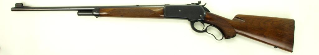 deluxe rifle, 24" round barrel, blue finish, walnut stocks, checkered with pistol grip shotgun butt plate, 3/4 mag, bolt peep sight. Barrel, magazine, receiver displaying 92-96% original blue, thinning on lever, light mark right side & loading gate. Crisp markings top of barrel, correct dove tail plug, stocks very good to near fine, light pressure marks mainly on rear stock. Smooth action, shiny/bright bore. Good collectors model 3 digit 71 with condition & options. Mfg'd 1936. Includes 2 boxes .348 cal. ammo. FFL required.