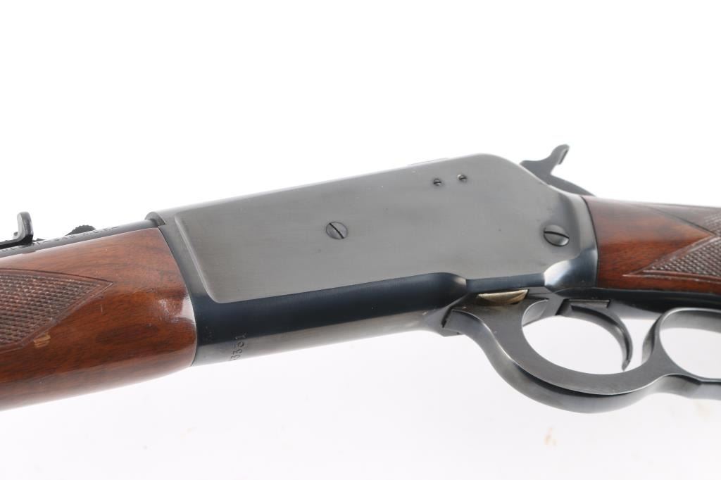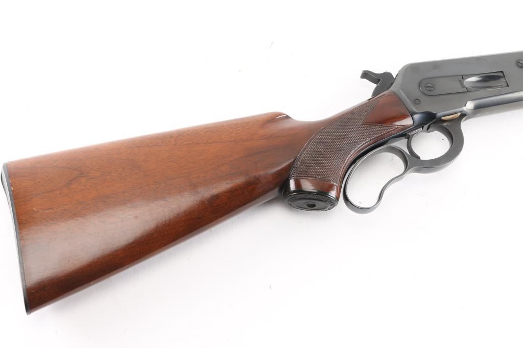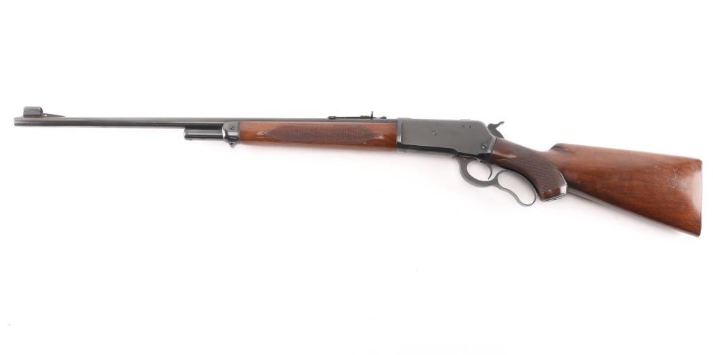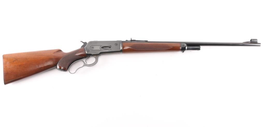 Vintage lever action repeating rifle chambered in .348 Winchester, manufactured in New Haven, CT circa 1955 (short tang). Features a blued finish, 24" tapered barrel, half-length tube magazine, ramped, hooded blade/bead front sight, adjustable semi-buckhorn rear sight, smooth trigger, serrated hammer spur, steel receiver, steel forend cap, checkered walnut forend and checkered grip shoulder stock with knurled steel buttplate, factory grip cap. Action is smooth/tight. Bore is excellent/bright, strong rifling. Wood is near excellent with some very minor scratches/dings. Blued finish is about 98% with minor edge wear/scratches. A really nice vintage 71.NRA Condition-Excellent. C&R Firearm.